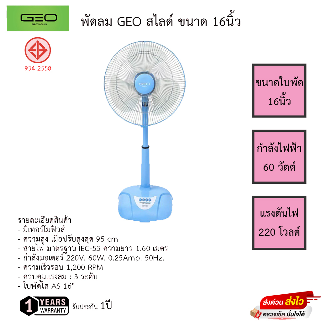 พัดลมตั้งพื้น GEO สไลด์ ปรับระดับ 16 นิ้วคละสี - รุ่น G-Force ปรับแรงลมได้ 3 ระดับ รับประกัน1ปี