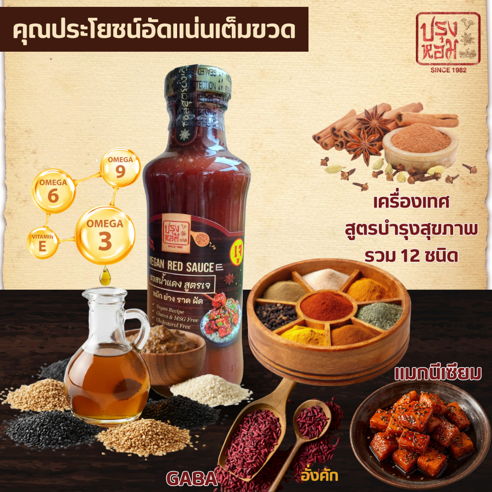 ซอสน้ำแดงพรีเมี่ยมสูตรเจ(Vegan Red Sauce)ลดโซเดียมลง45% อุดมคุณค่าจากเครื่องเทศ12ชนิด น้ำมันงา 220ก.