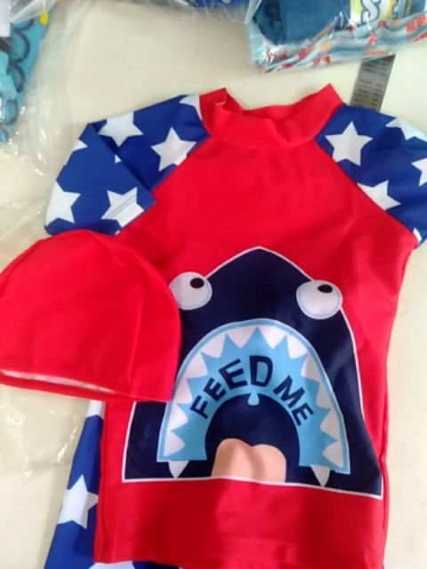 🇹🇭ส่งไวทันที 🇹🇭ชุดว่ายน้ำเด็ก สีฟ้า 3 ชิ้น (เสื้อ+กางเกง+หมวก)