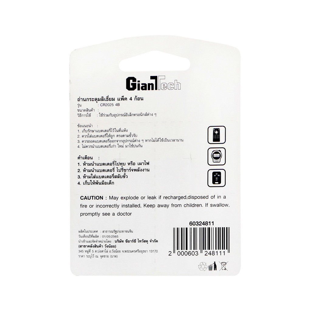 GIANTTECH ถ่านกระดุมลิเธี่ยม รุ่น CR-2025 (แพ็ค 4 ก้อน)