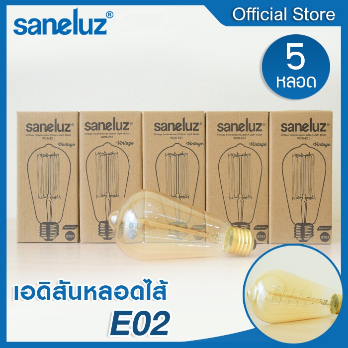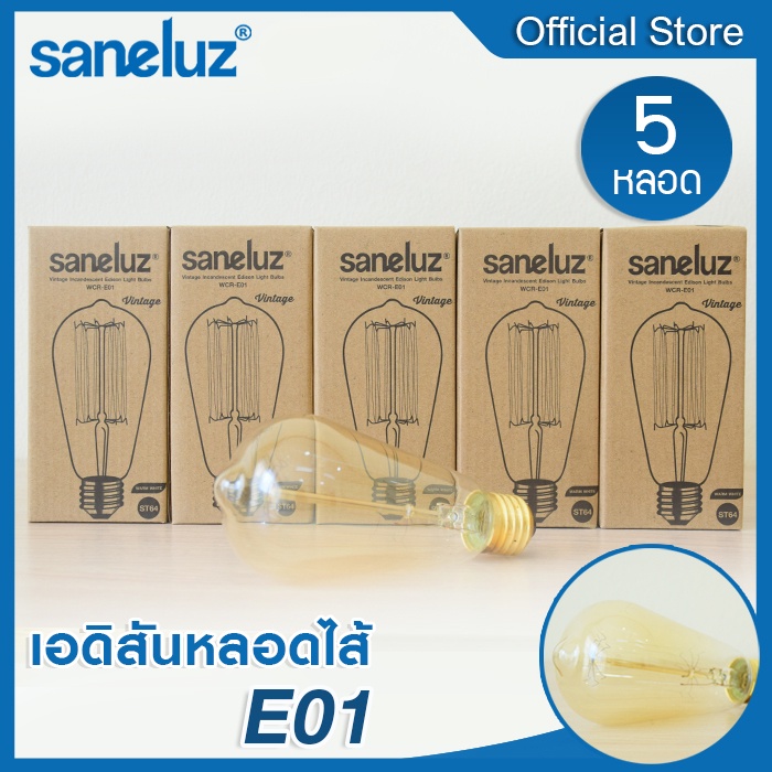 Saneluz 5 หลอด ไฟเอดิสัน 40W รุ่นST64 ไส้ตรง และ ไส้หมุน ขั้วE27 ใช้งานไฟบ้าน AC220V ไฟตกแต่ง สไตส์ Vintage หลอดไฟวินเทจ