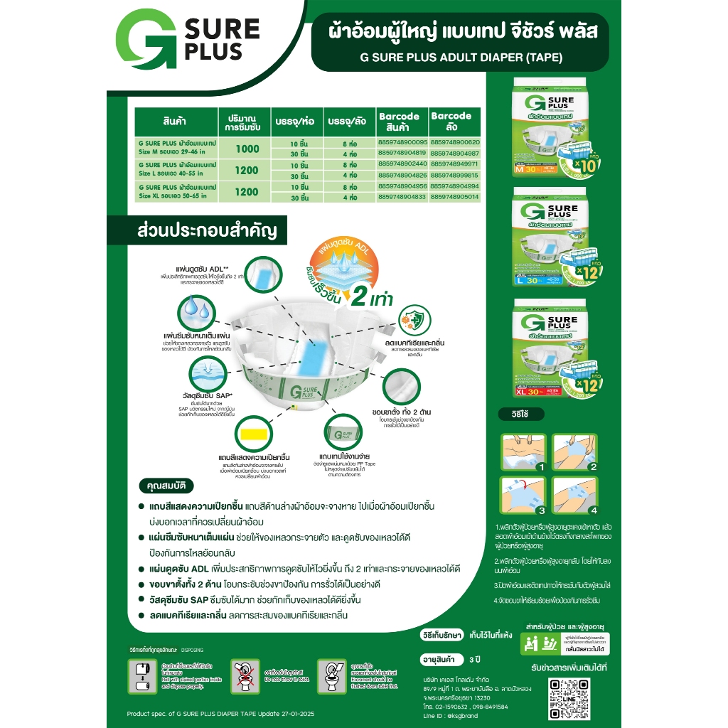 [KSG Official] จีชัวร์พลัส ผ้าอ้อมผู้ใหญ่ แบบเทปกาว G Sure Plus Diaper TAPE