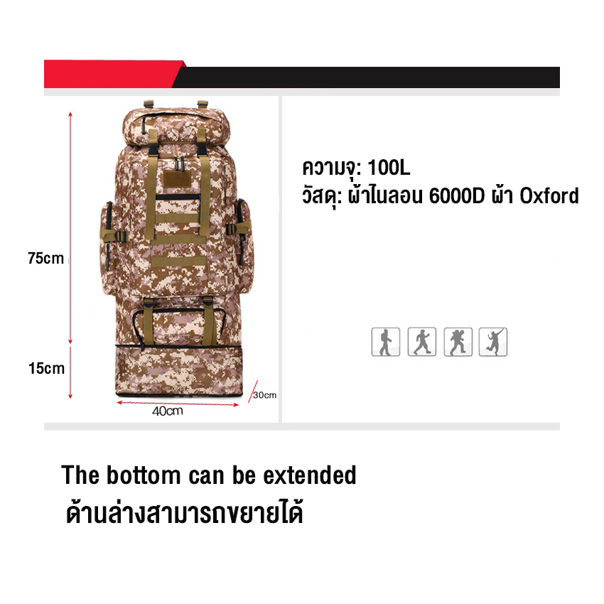 กระเป๋าเดินป่า 100L ลายทหาร กระเป๋าเป้สะพายหลังความจุขนาดใหญ่พิเศษ เหมาะสําหรับการเดินทาง
