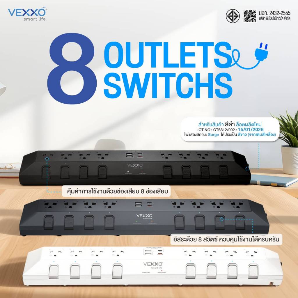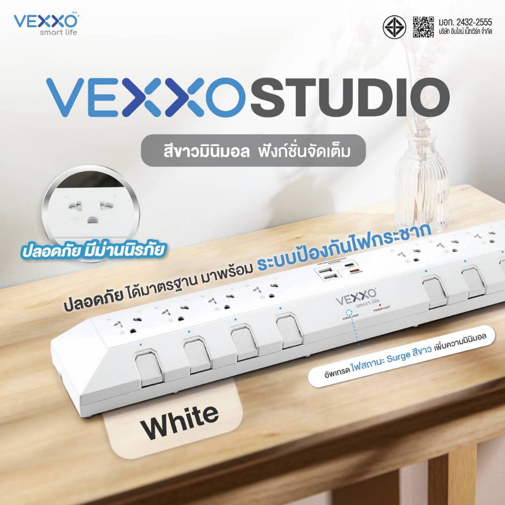 VEXXO StudioPowerStrip ปลั๊กไฟสตูดิโอ มีระบบกันไฟกระชาก ปลั๊กไฟมอก. 8ช่อง8สวิตซ์ (สีเทา/สีดำ/สีขาว)