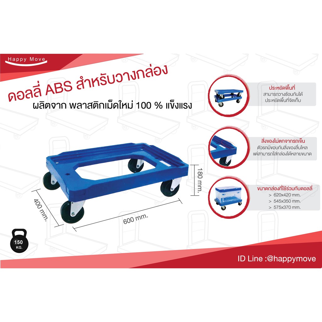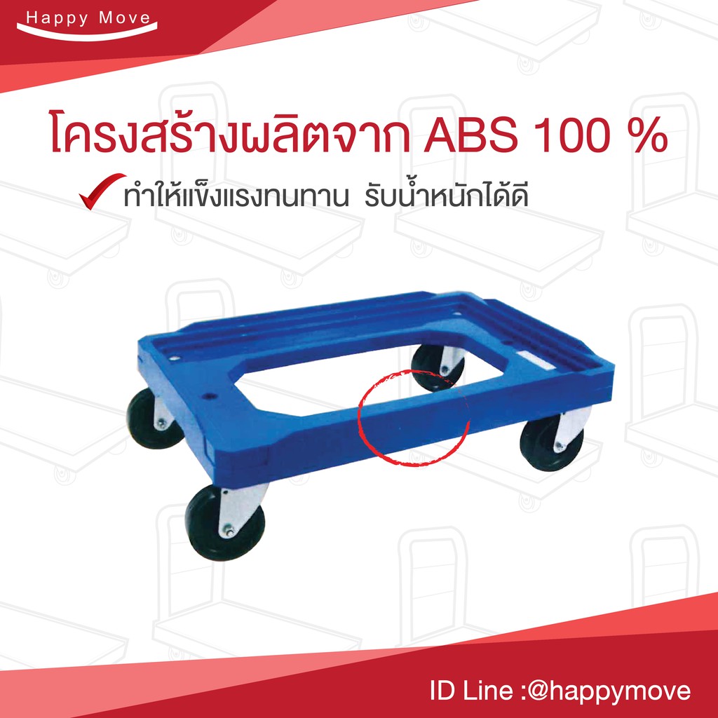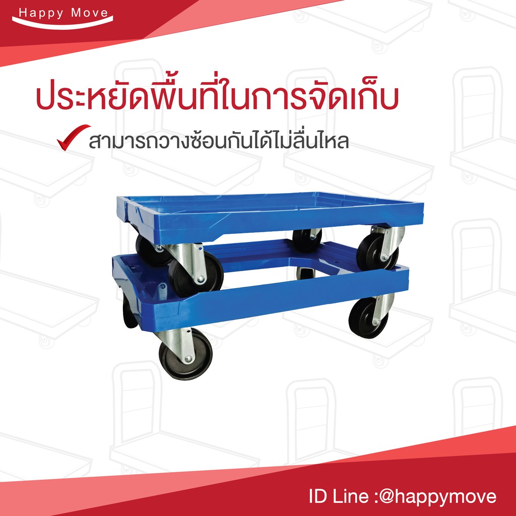 รถเข็นกล่องลังพลาสติก ใส่ได้ 3 ขนาด ไม่มีแฮนด์ ผลิตจากพลาสติกABS มีขอบกันกล่องลื่นไหล (ไม่รวมกล่อง) Happy Move