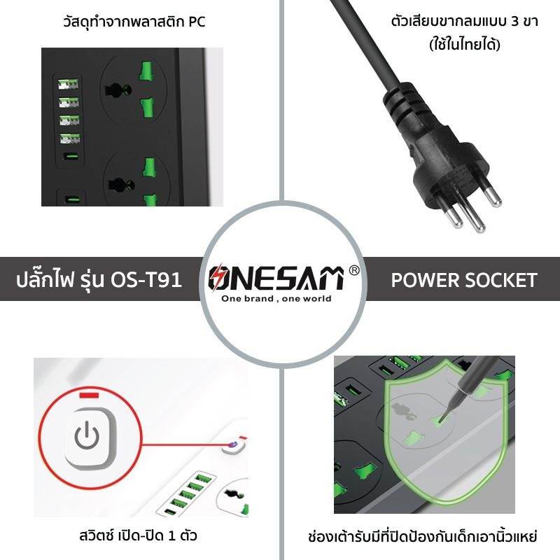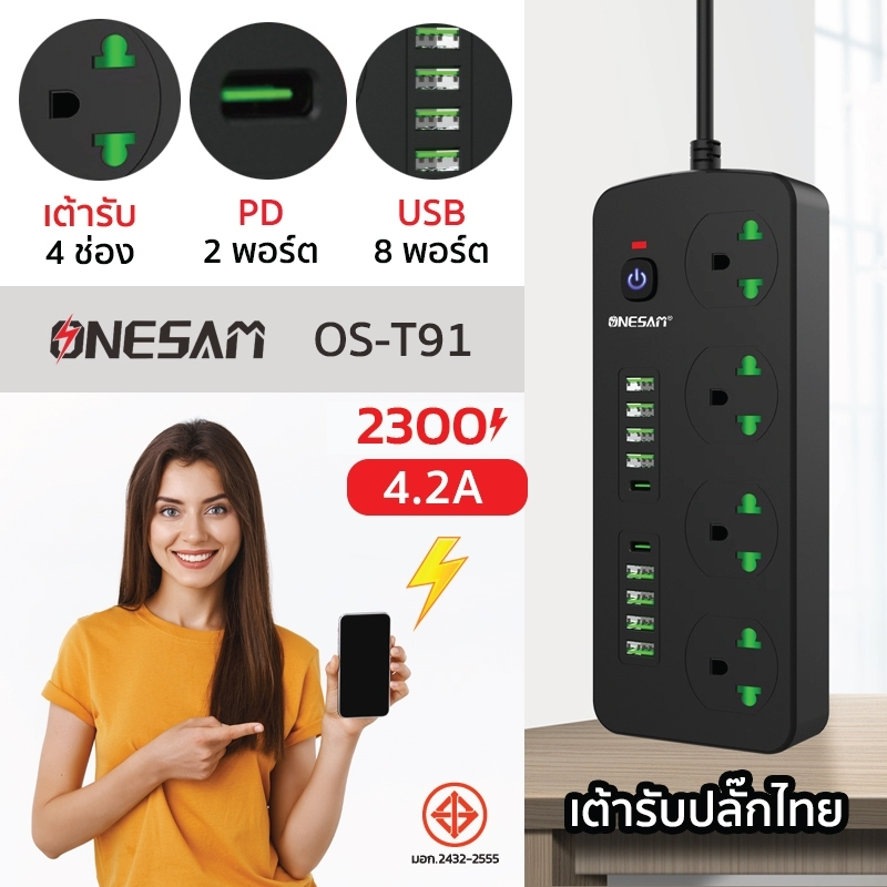 ปลั๊กไฟ ONESAM รุ่น OS-T91(PLUG THAI) **เต้ารับไทย**4 ช่อง 4.2A 2300W PD2พอร์ต USB8พอร์ต ยาว 2,5เมตร