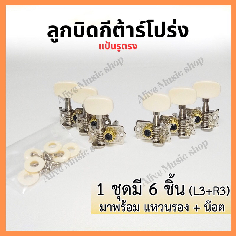 ลูกบิดกีต้าร์โปร่งใบพลาสติก 2 รู มี 2 แบบ(รูเอียง/รูตรง) ครบชุดทั้ง 6 ตัวพร้อมน๊อตและแหวนรอง