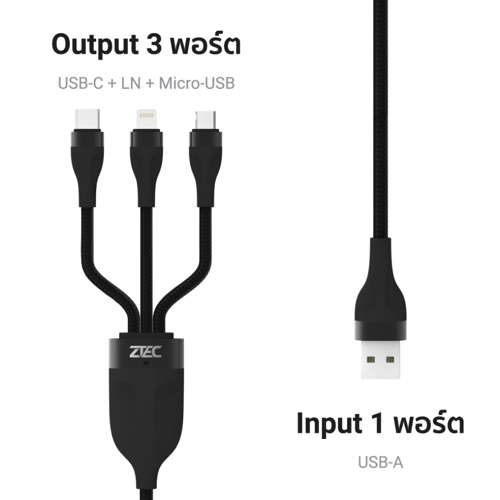 [ลดเหลือ 269] ZTEC ZM411 สายชาร์จ 3 พอร์ต USB-C , Micro-USB , LN รองรับชาร์จเร็ว สายถัก แข็งแรงทนทาน-2Y