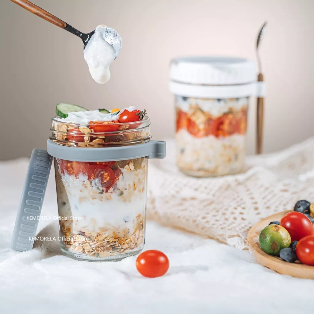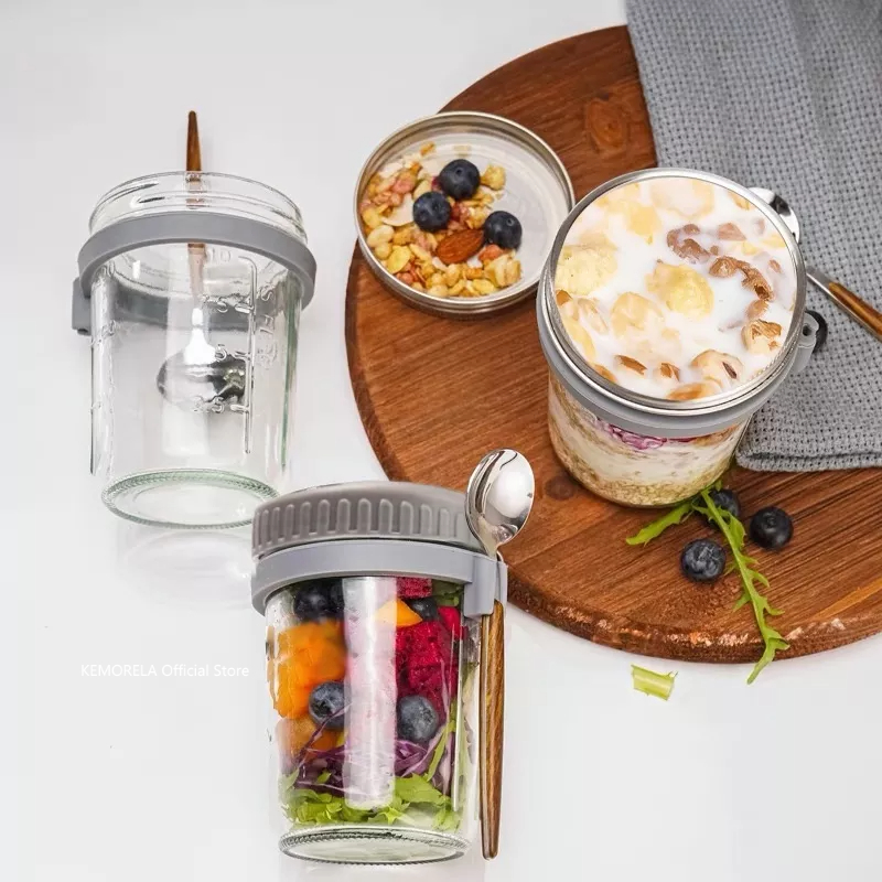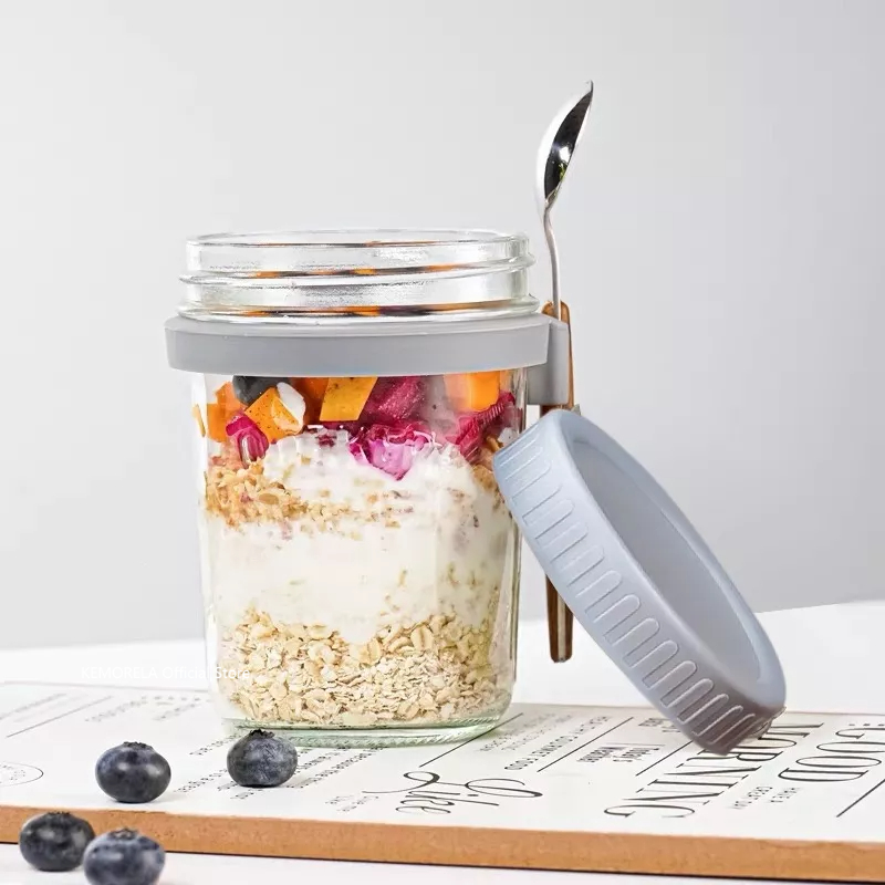 KEMORELA แก้วน้ำ ถ้วยข้าวโอ๊ตนม ถ้วยกาแฟอาหารเช้าพร้อมช้อนฝา ขวดโหลปากกว้างพร้อมฝาและช้อน ขวดข้าวโอ๊ตค้างคืน ขวดเมสัน แก้วปิดผนึกแบบพกพา ถ้วยข้าวโอ๊ต ขวดน้ำ ขวดแก้วข้าวโอ๊ตพร้อมฝาและช้อ Overnight Oats Jars Oatmeal Cup Breakfast Coffee Cup with Lid Spoon