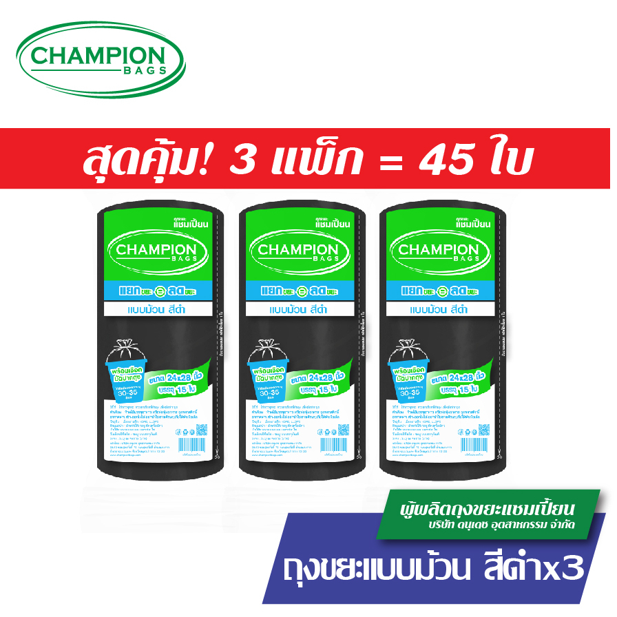 แพ็ค 3-ม้วนดำ(ดึงได้ทีละใบ-รุ่นประหยัด)Champion Bags ถุงขยะแชมเปี้ยน