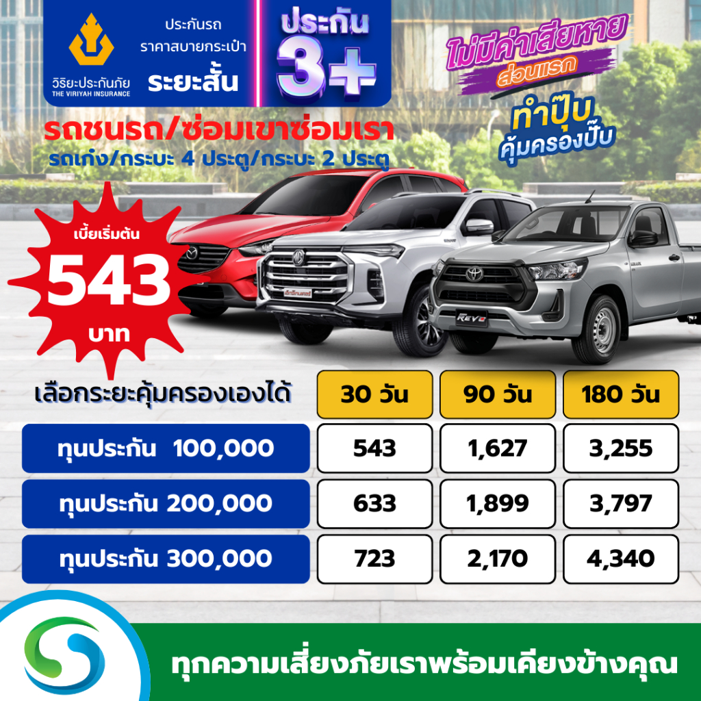 ประกัน 3+ ระยะสั้น วิริยะประกันภัย ประกันภัยรายวัน คุ้มครองรถชนรถ ซ่อมเขาซ่อมเรา เลือกความคุ้มครองได้ตามใจ (30, 60 วัน)