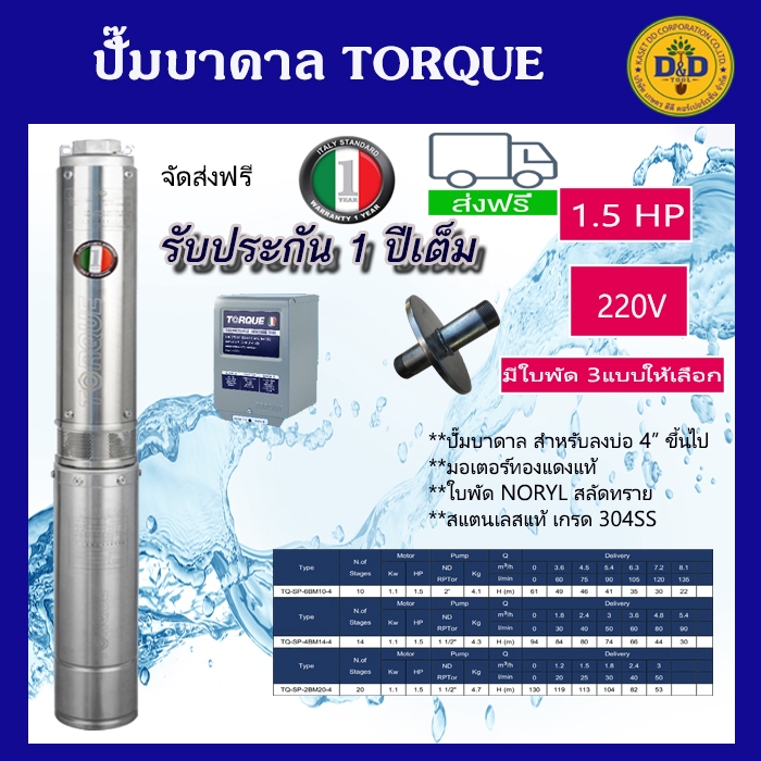 TORQUE 🇹🇭 ปั๊มบาดาล 1.5HP 220V ดูดน้ำลึก submersible ปั๊มน้ำอิตาลี ทอร์ค(แถม กล่องสตาร์ทและฝาบ่อ)