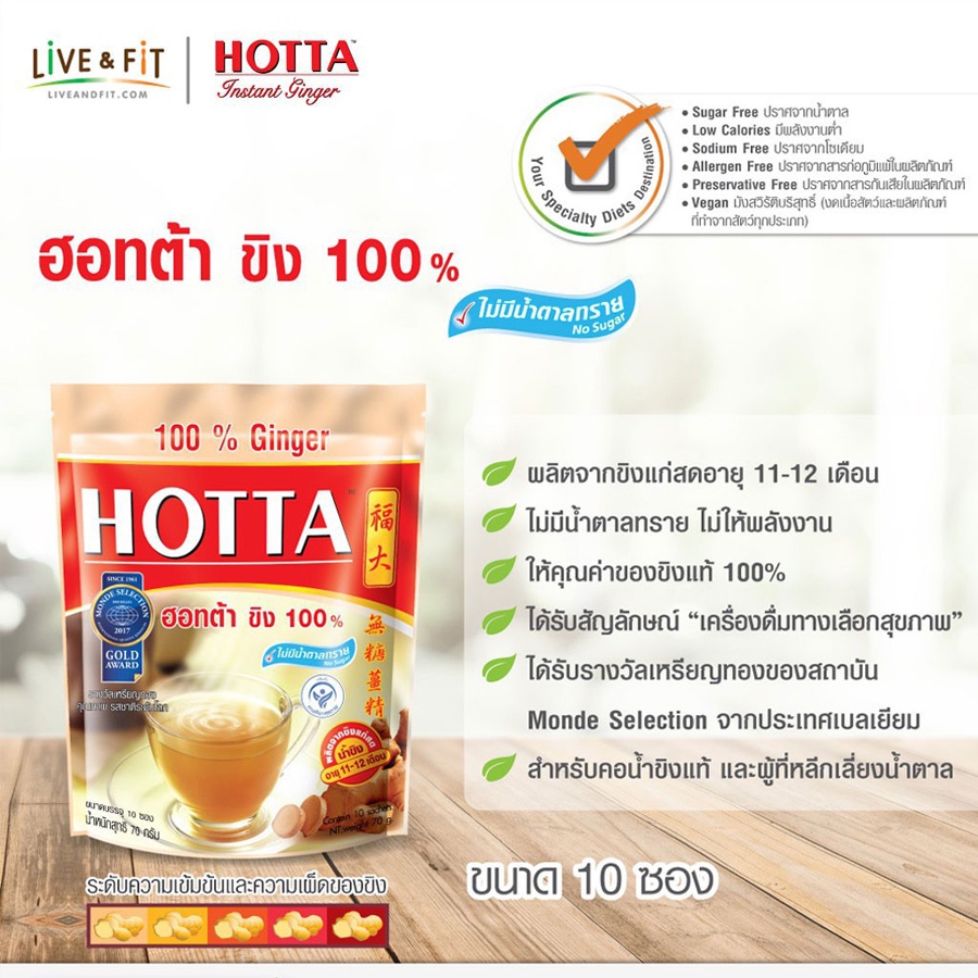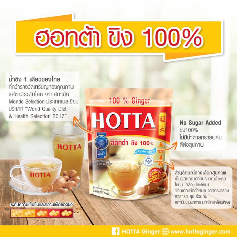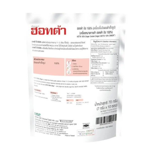 HOTTA น้ำขิง ฮอทต้า เครื่องดื่มขิงผงสำเร็จรูป ขิง 100% ไม่มีน้ำตาลทราย ขนาด 10 ซอง 1 ถุง