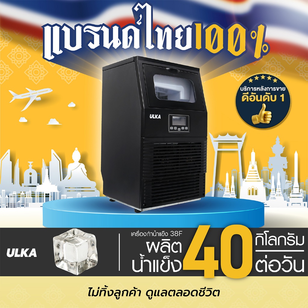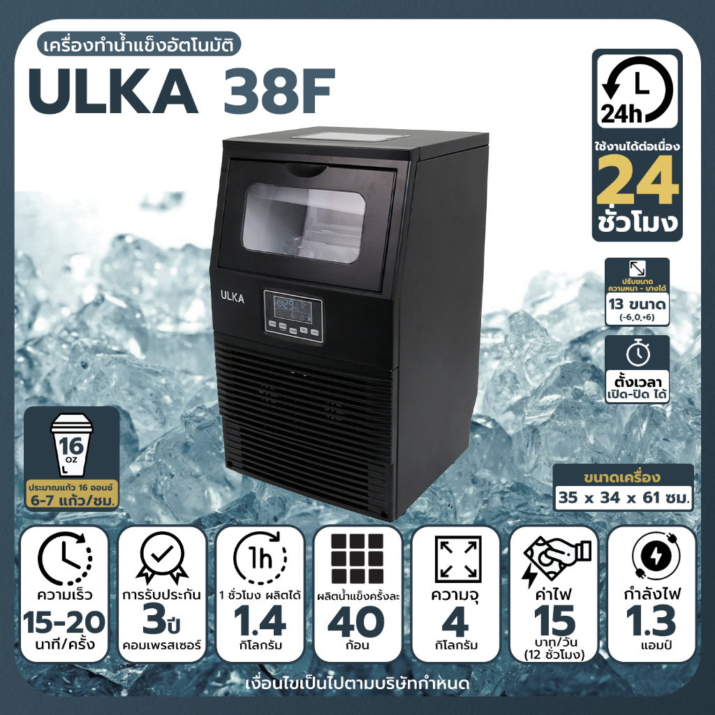 เครื่องทำน้ำแข็ง ULKA 38F กำลังการผลิต 40 กก./วัน เติมน้ำได้ 3 แบบ เครื่องผลิตน้ำแข็ง ใช้ภายในบ้าน หรือ ร้านขนาดเล็ก