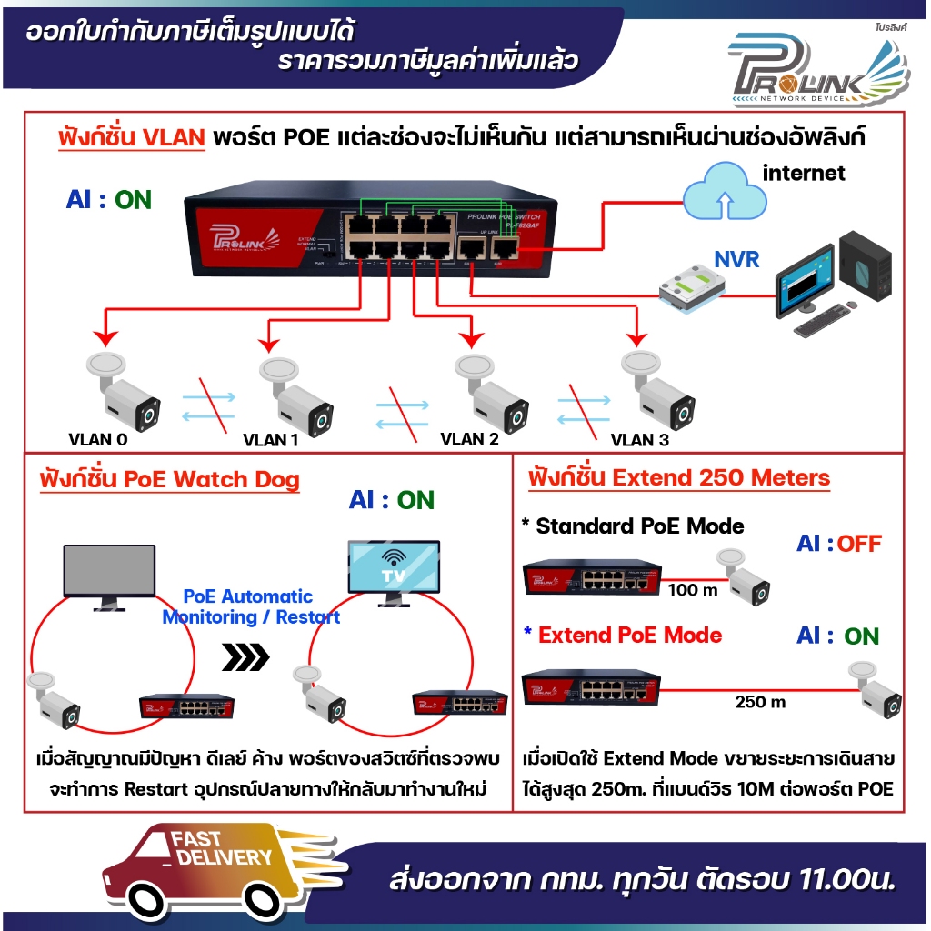 (รับประกัน 2 ปี) (uplink 1000M) PROLINK POE Switch 8 ช่อง 100Mbps + 2 อัพลิงก์ 1000Mbps / Fast Ethernet POE Switch 8 Por