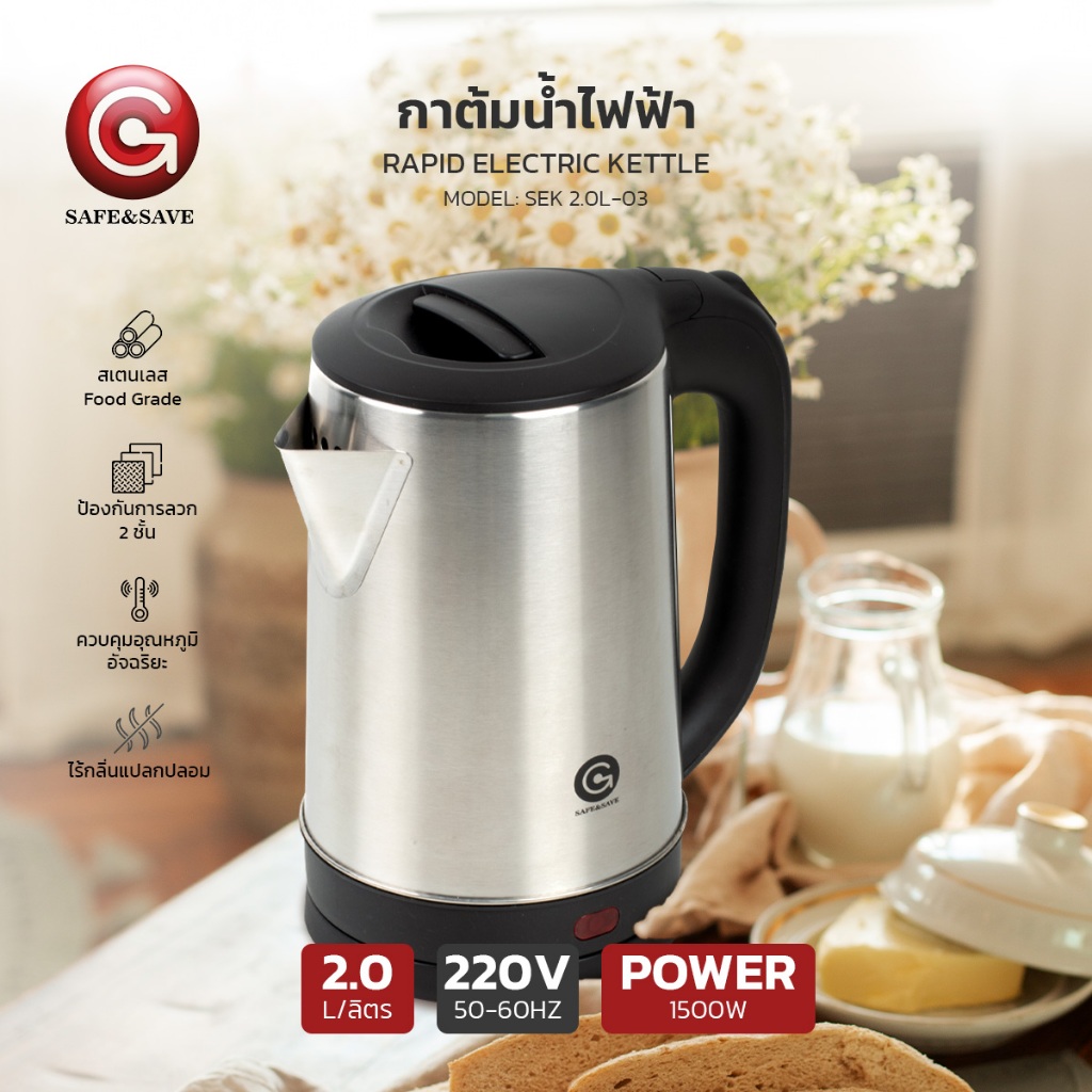 กาต้มน้ำไฟฟ้า SAFE&SAFE กาน้ำร้อน ความจุ 2.0 ลิตร 1500วัตต์
