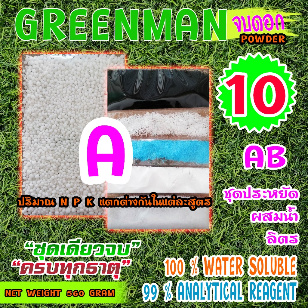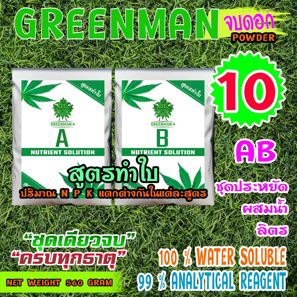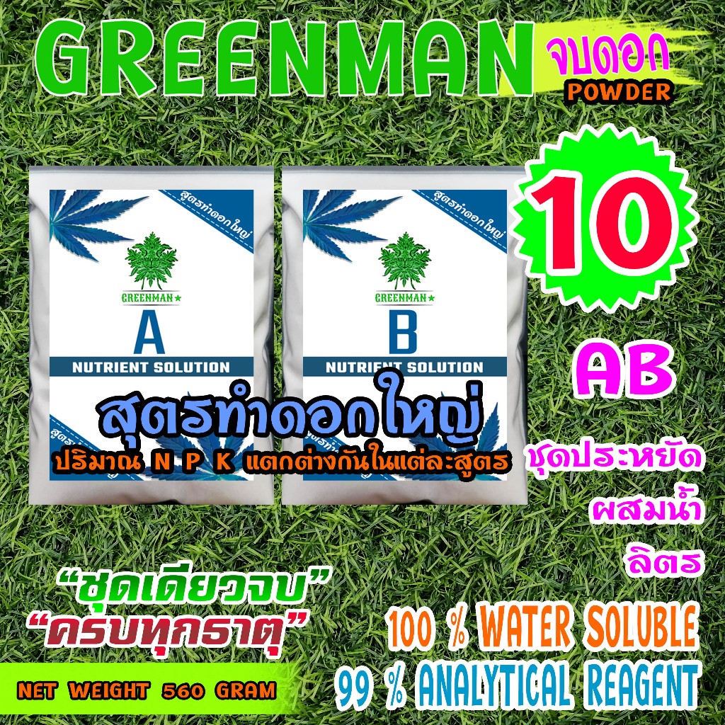 ปุ๋ย AB GREENMAN สมุนไพรจบดอก 3 สูตร ชนิดผง เร่งใบ เร่งดอก ดอกใหญ่ ช่อดอกแน่น เพิ่มไตรโคม รสชาติดี
