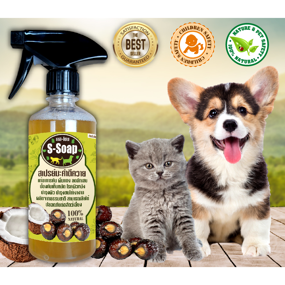 สเปรย์แก้คันS-Soap ลดอาการคัน ขับไล่เห็บหมัด ขนเงางามผลิตจากผลมะคำดีควายแท้ ขนาด 400 ml.