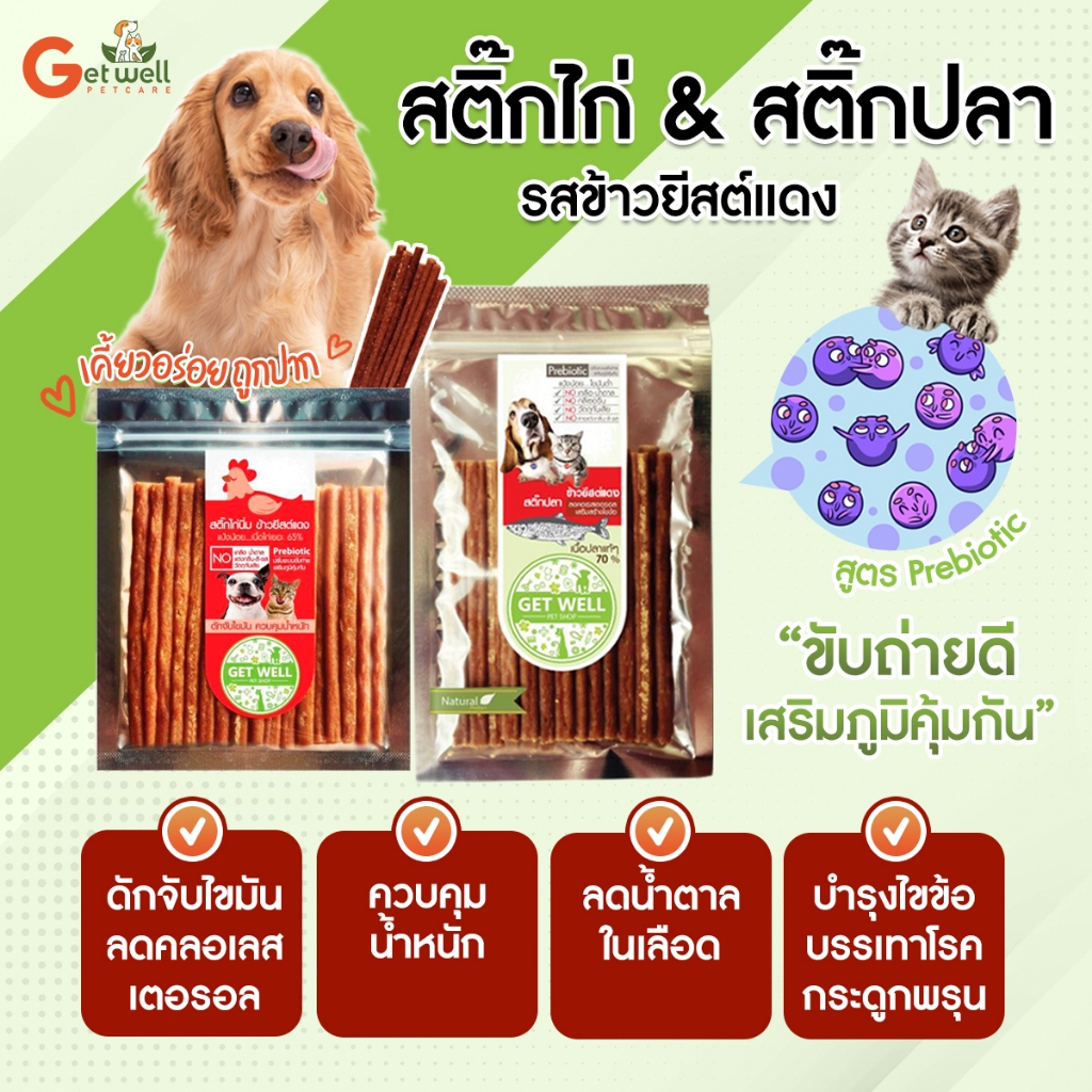 Get Well สติ๊กปลานิ่ม สูตร Prebiotic รสข้าวยีสต์แดง 50 ก ขนมหมา ขนมแมว นิ่มๆ เคี้ยวง่าย ไม่ปรุงรส