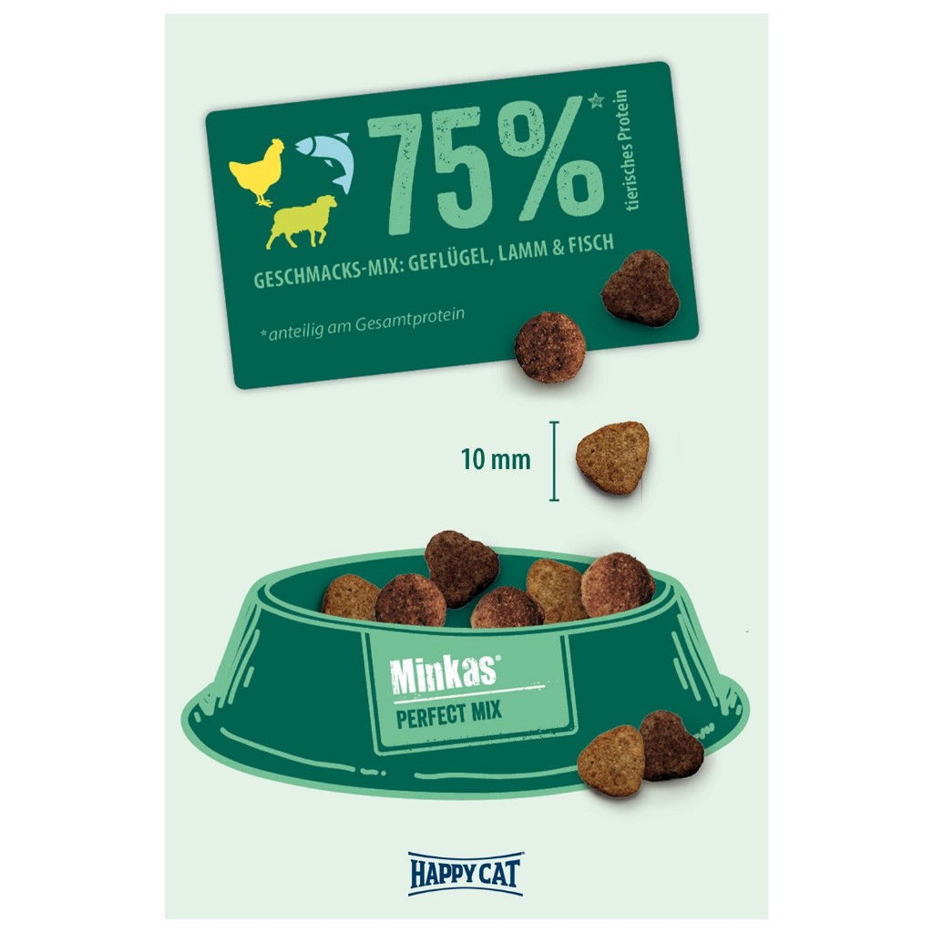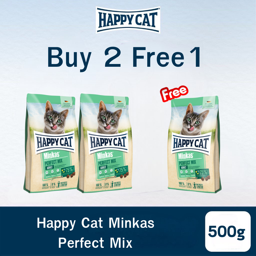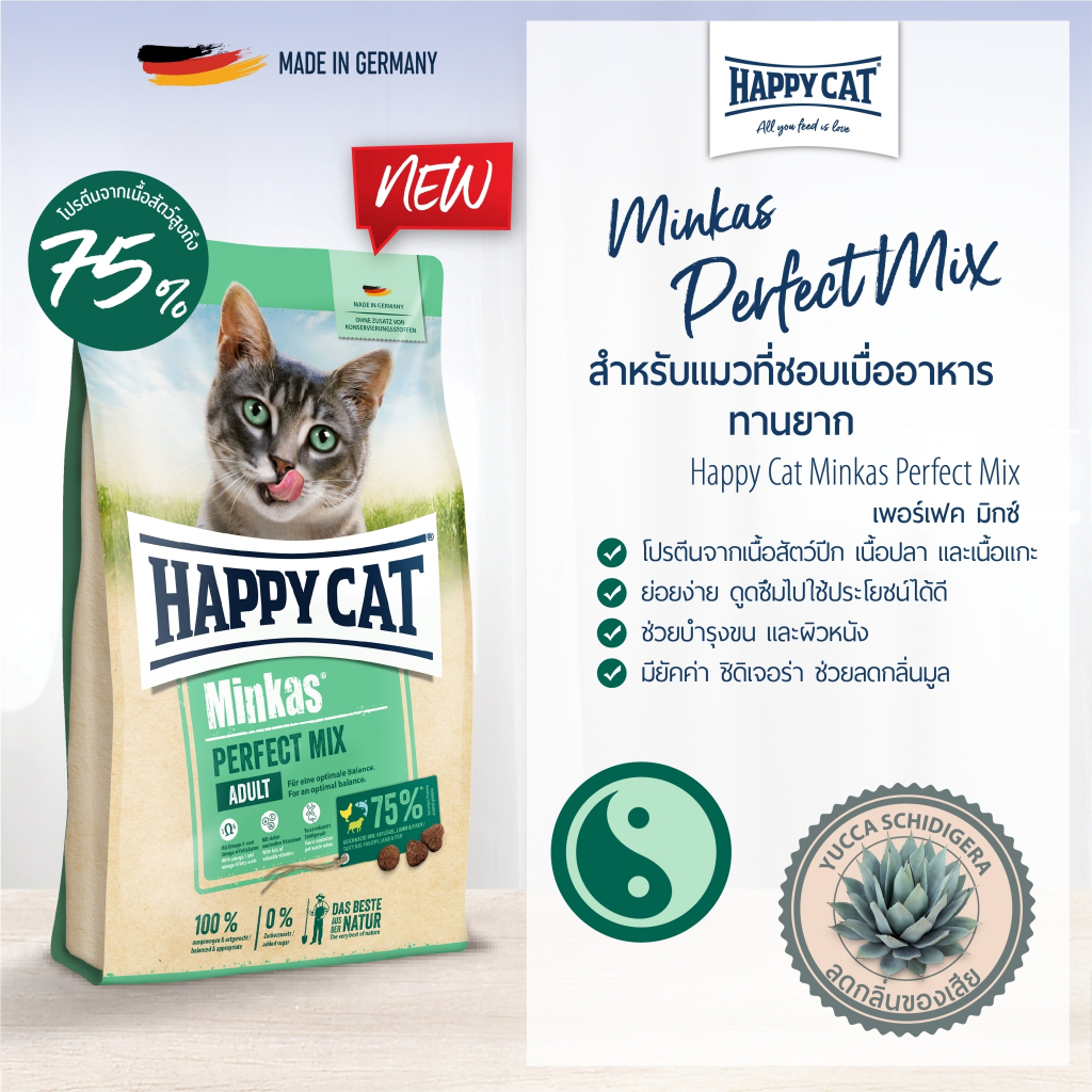 HAPPY CAT Minkas Perfect Mix สูตรแมวโต ย่อยง่าย บำรุงขนและผิวหนัง เนื้อสัตว์ปีก เนื้อปลา และเนื้อแกะ 500 g