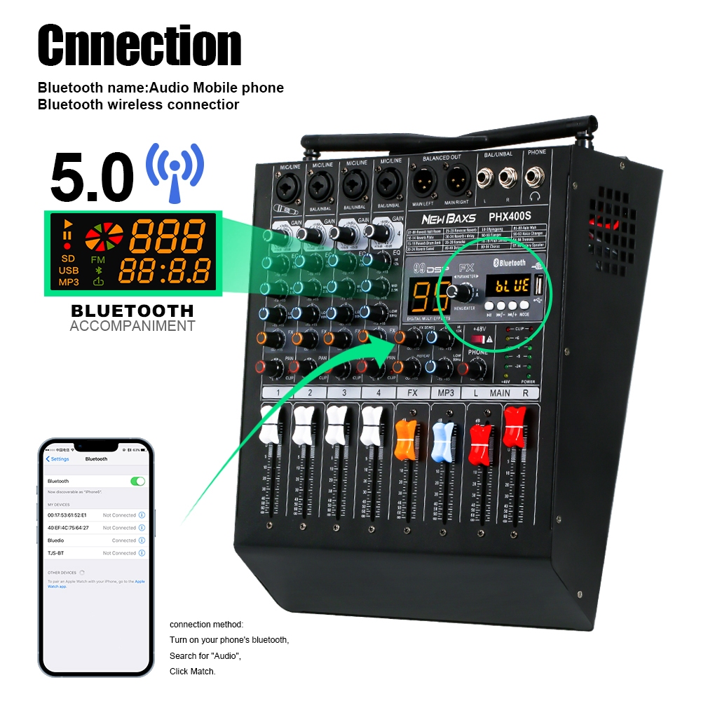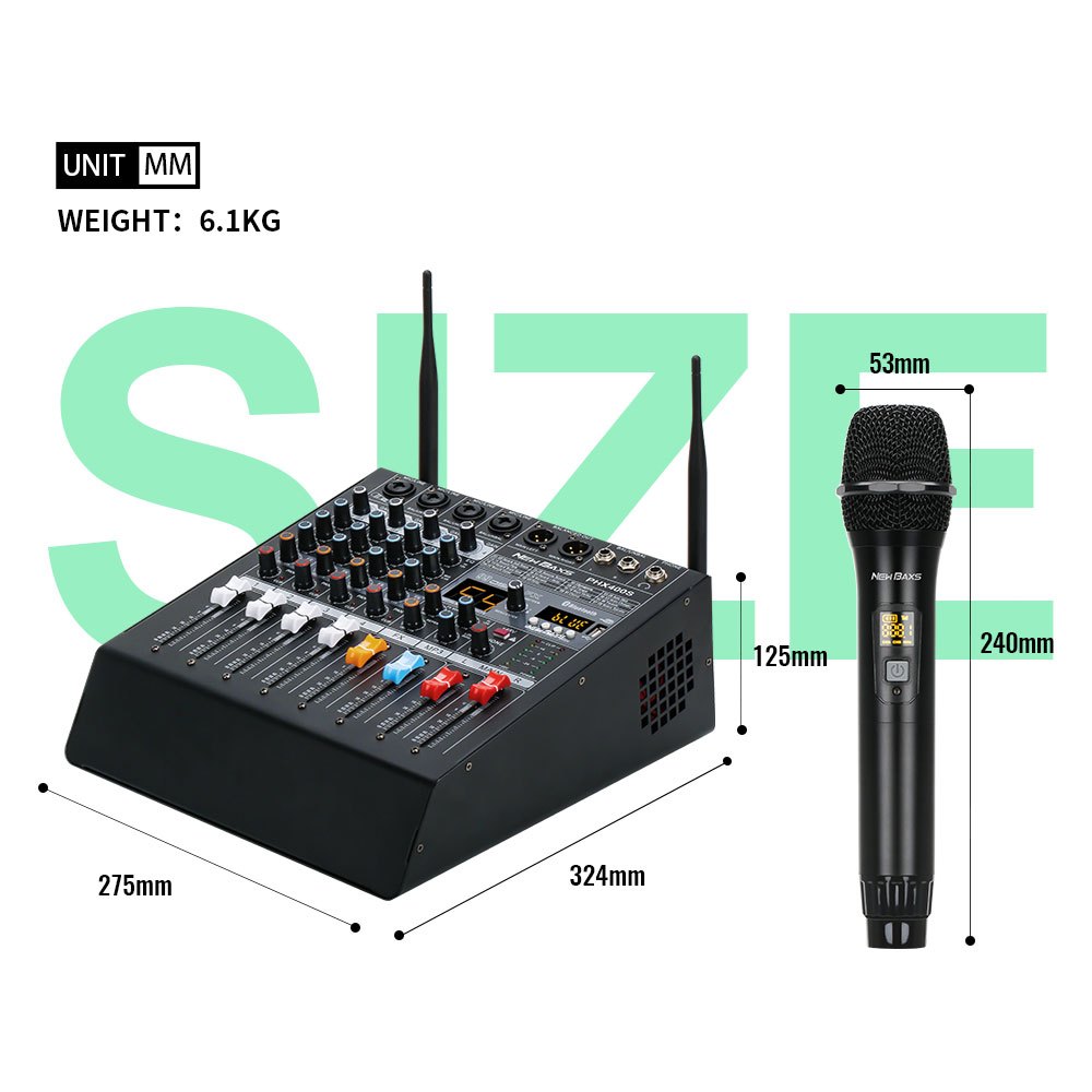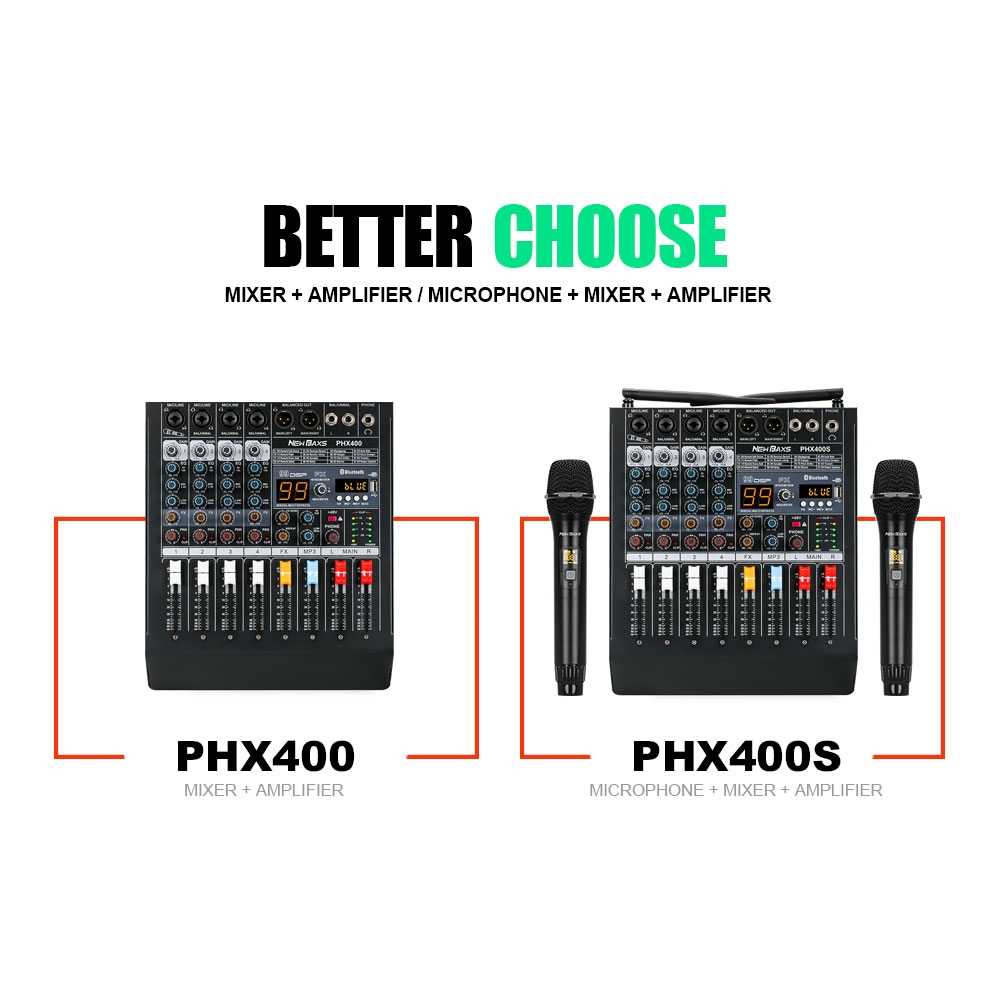 NEW BAXS เครื่องผสมพลังงาน 650W*2 99DSP 4 ช่องทาง +2ไมโครโฟนไร้สาย USB/บลูทูธ,การบันทึก,รีเวิร์บ PHX400S มิกเซอร์ MIXER