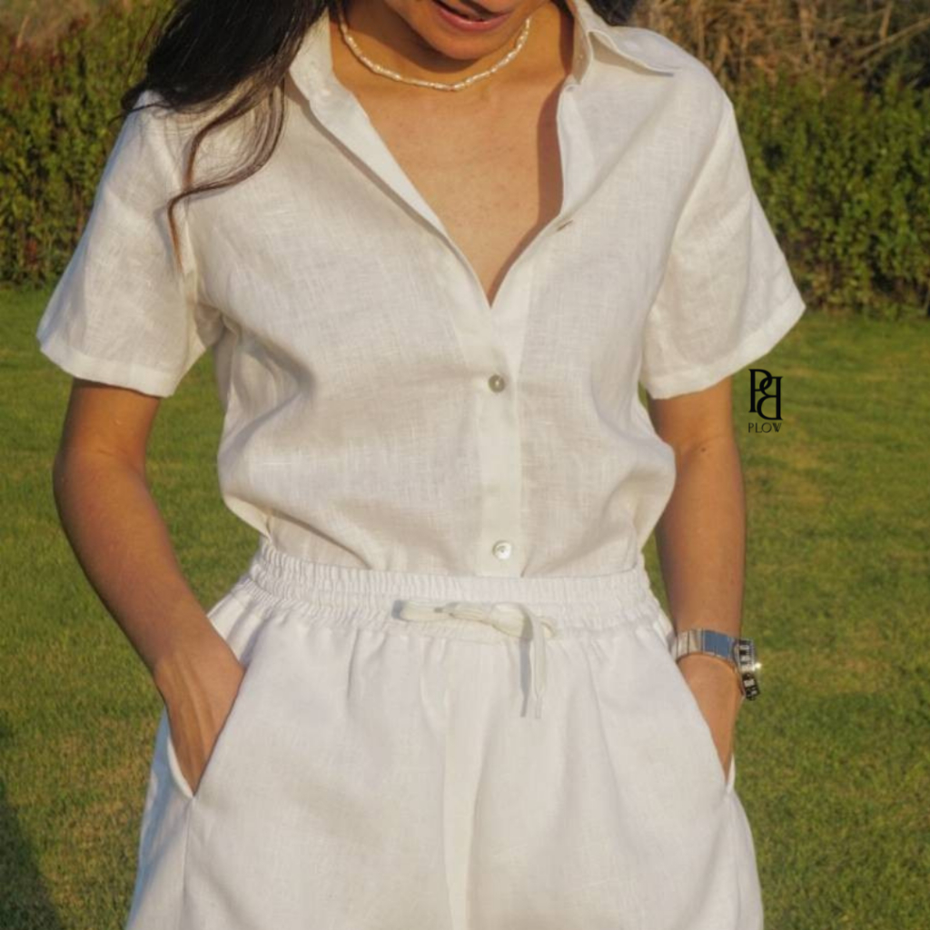 [เฉพาะเสื้อ] PLOWBRANDS TS0007 Basic shirt เสื้อเชิ้ตผ้าลินิน เชิ้ตแขนสั้นผู้หญิงแบบเรียบง่ายมี3sizes เนื้อผ้าเย็นสบาย