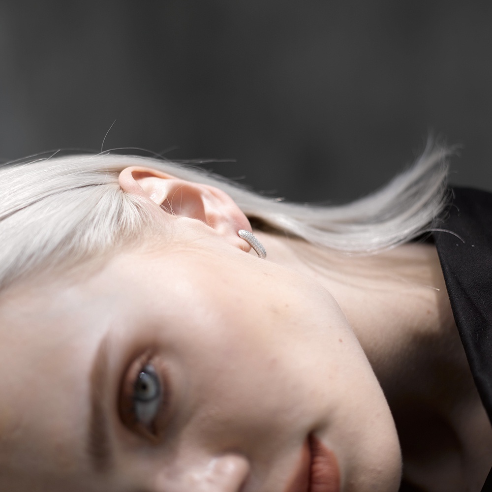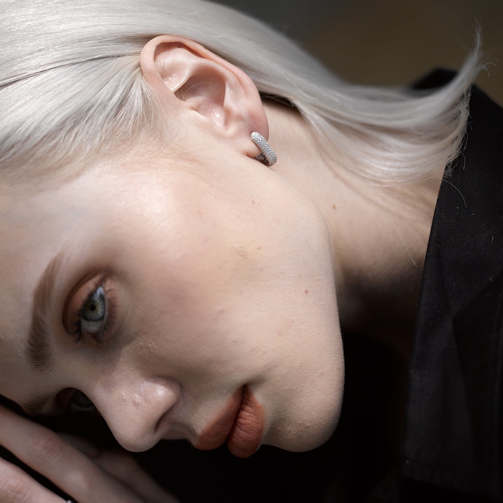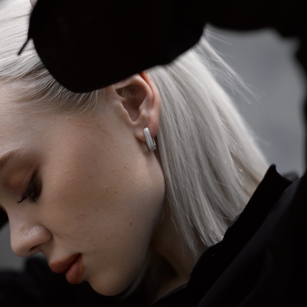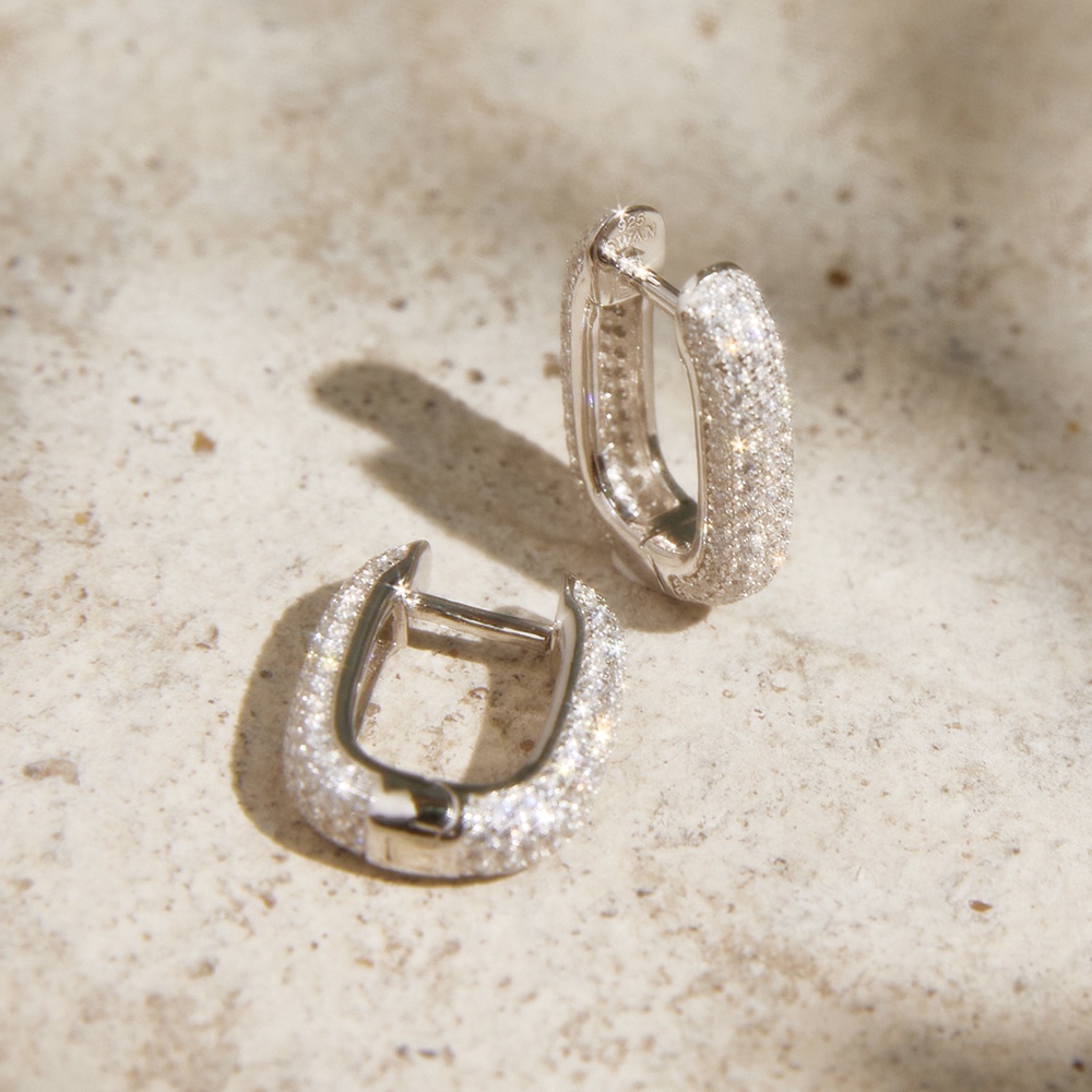 [ส่งด่วนฟรี]SWAN - Small Hoop Pave Earring ต่างหูเงินแท้ ทรงห่วงเหลี่ยม ฝังเพชรคิวบิกเซอร์โคเนีย