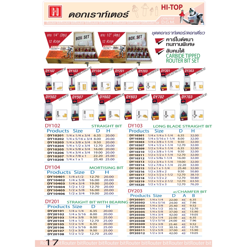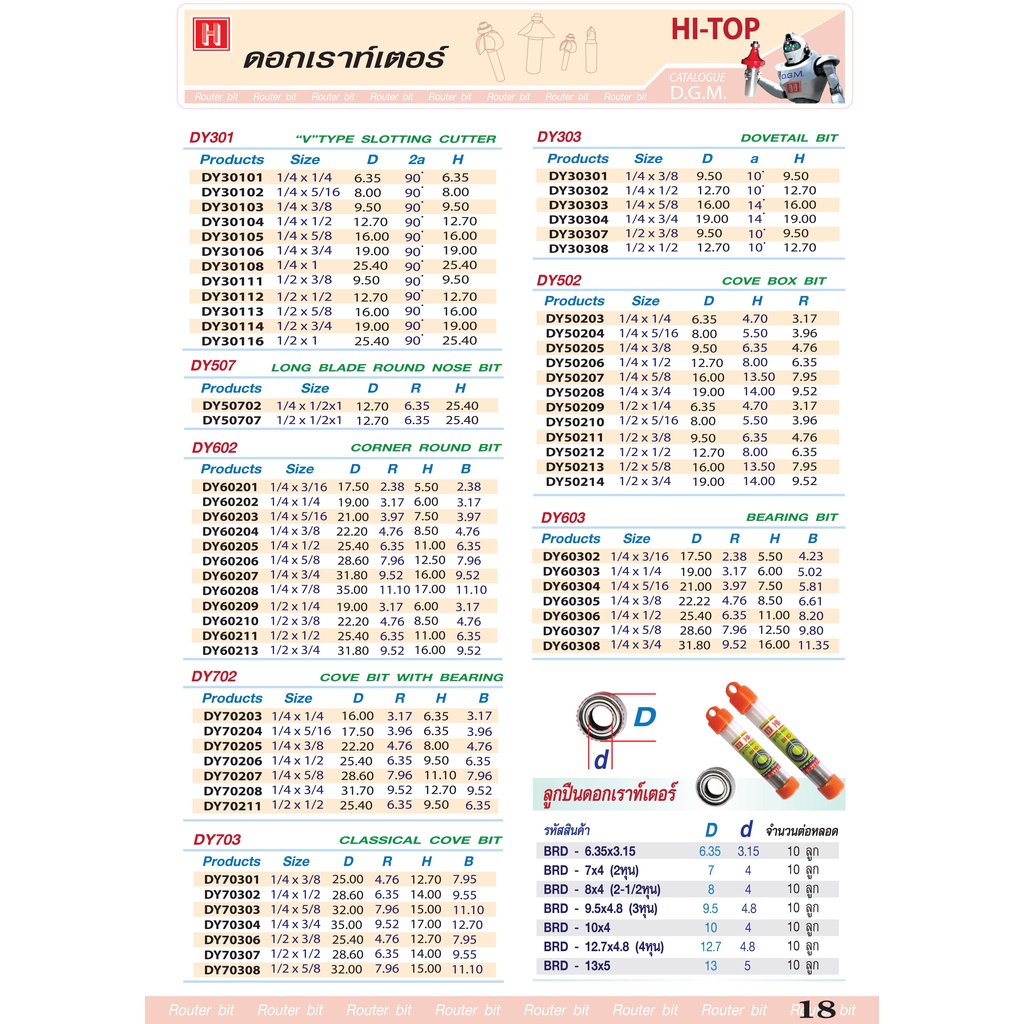 ดอกเราท์เตอร์ ใบมีดคาร์ไบด์หนา ขนาดแกนให้เลือก 1/4" (2หุล) , 1/2" (4หุล) ยี่ห้อ HI-TOP รุ่น DY-103