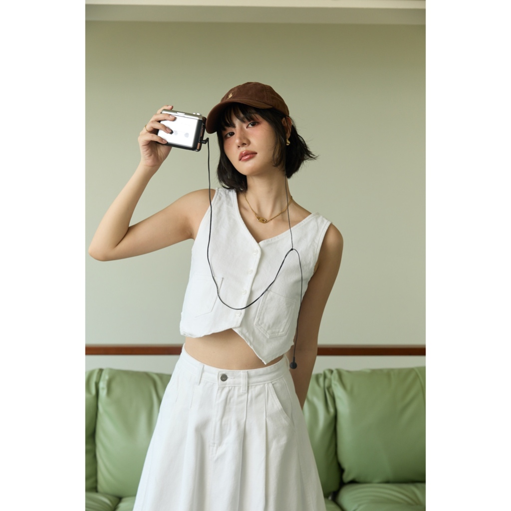 Sis story เสื้อกั๊ก กระดุมหน้า ทรงครอป Sis T06 Lilo cropped button up denim vest - Blue/Dark Blue