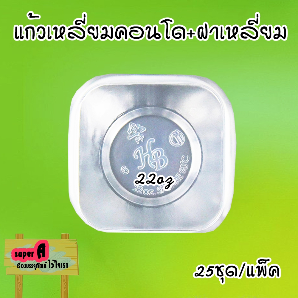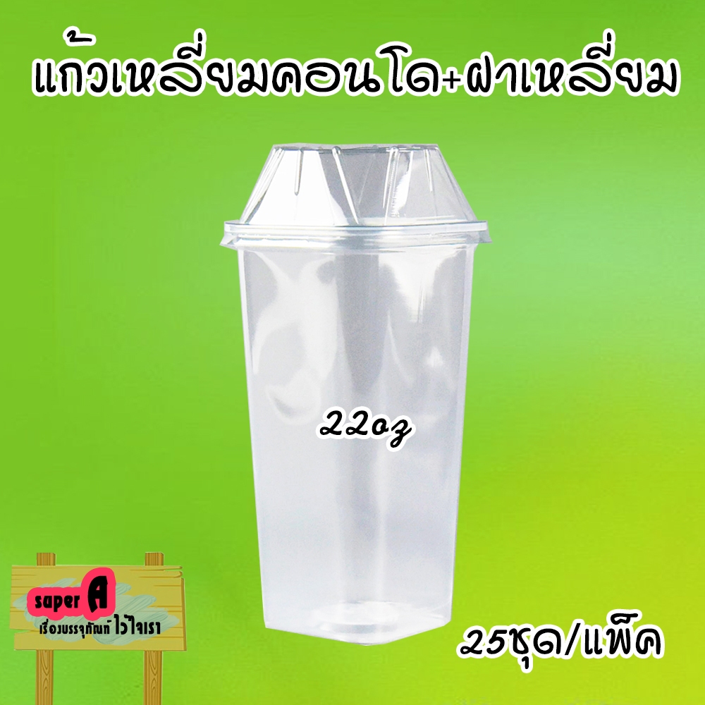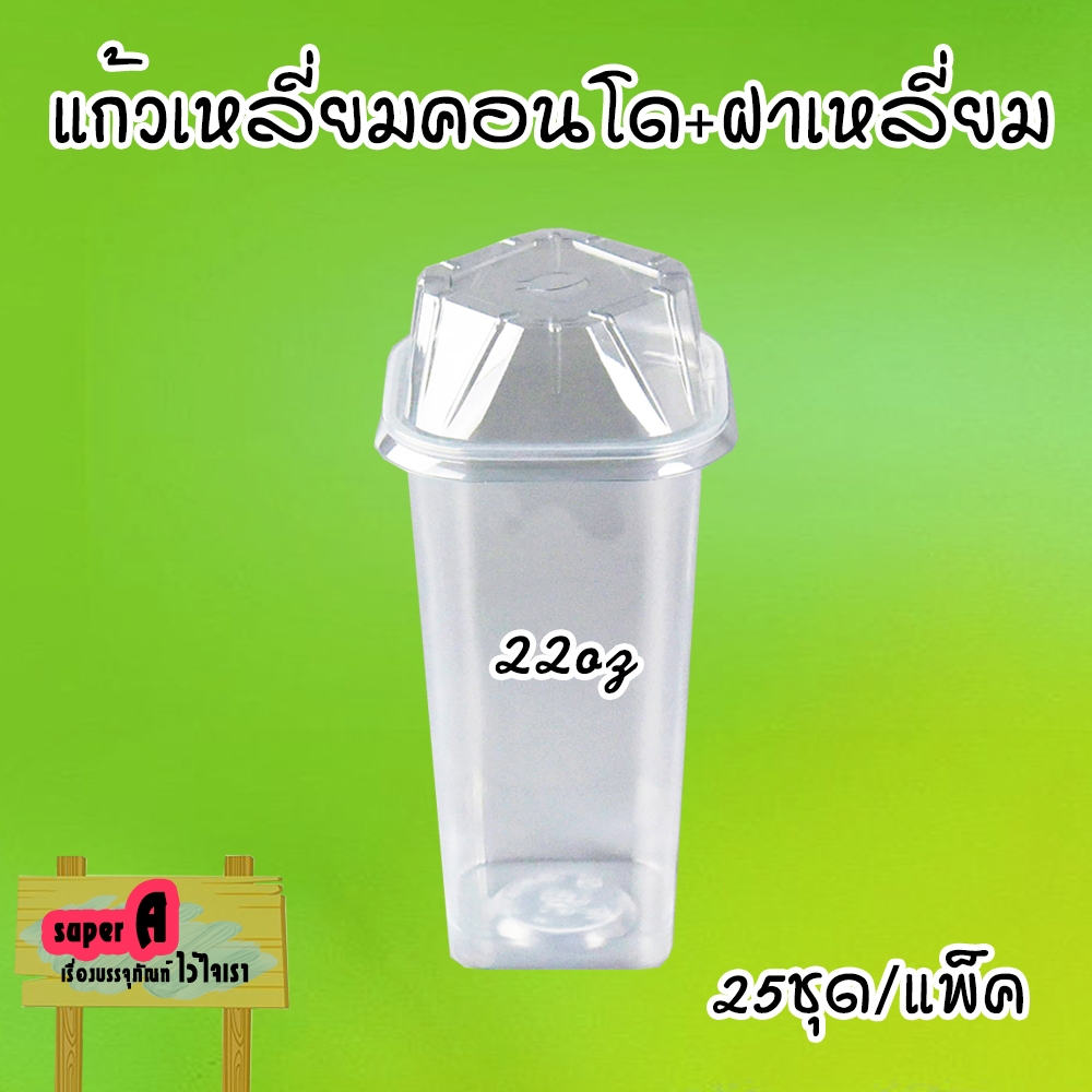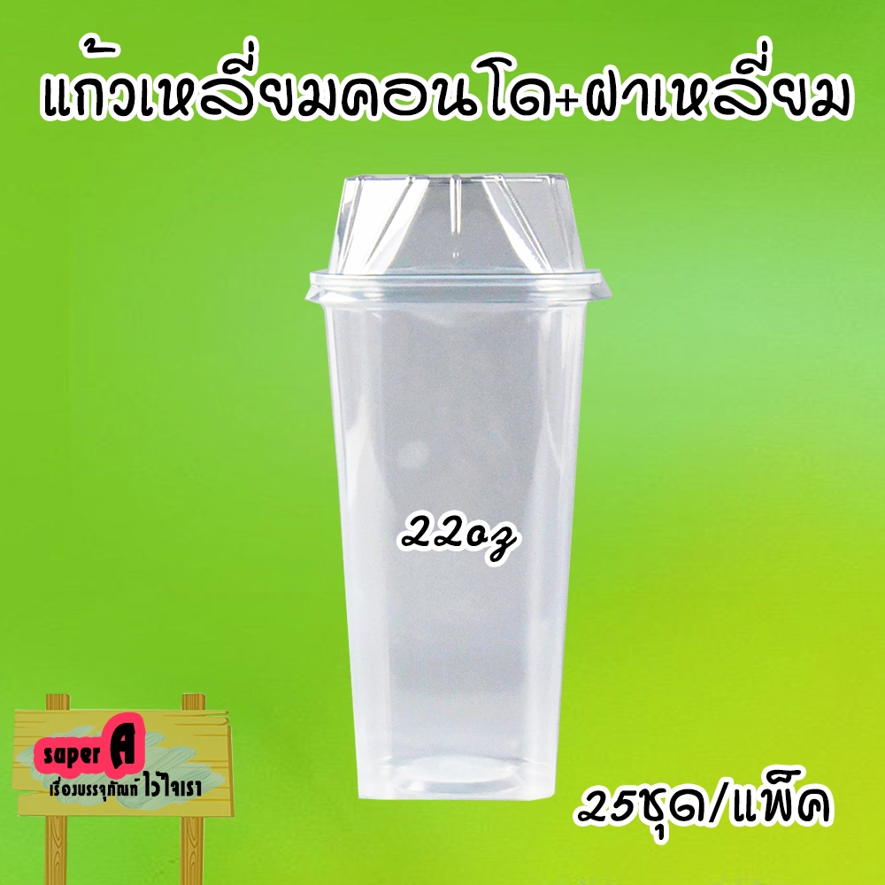แก้วพลาสติกเหลี่ยม ทรงคอนโด ตราฮอร์นบอย 22oz พร้อมฝาเหลี่ยม ปาก 95mm (25ชุด/แพ็ค)