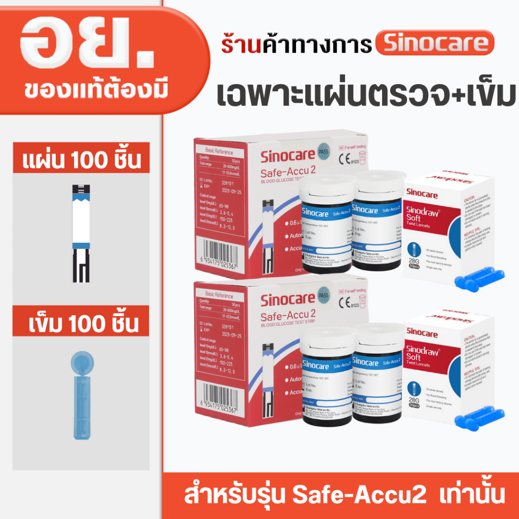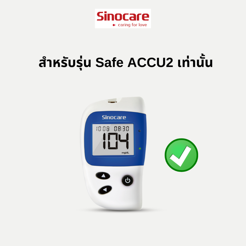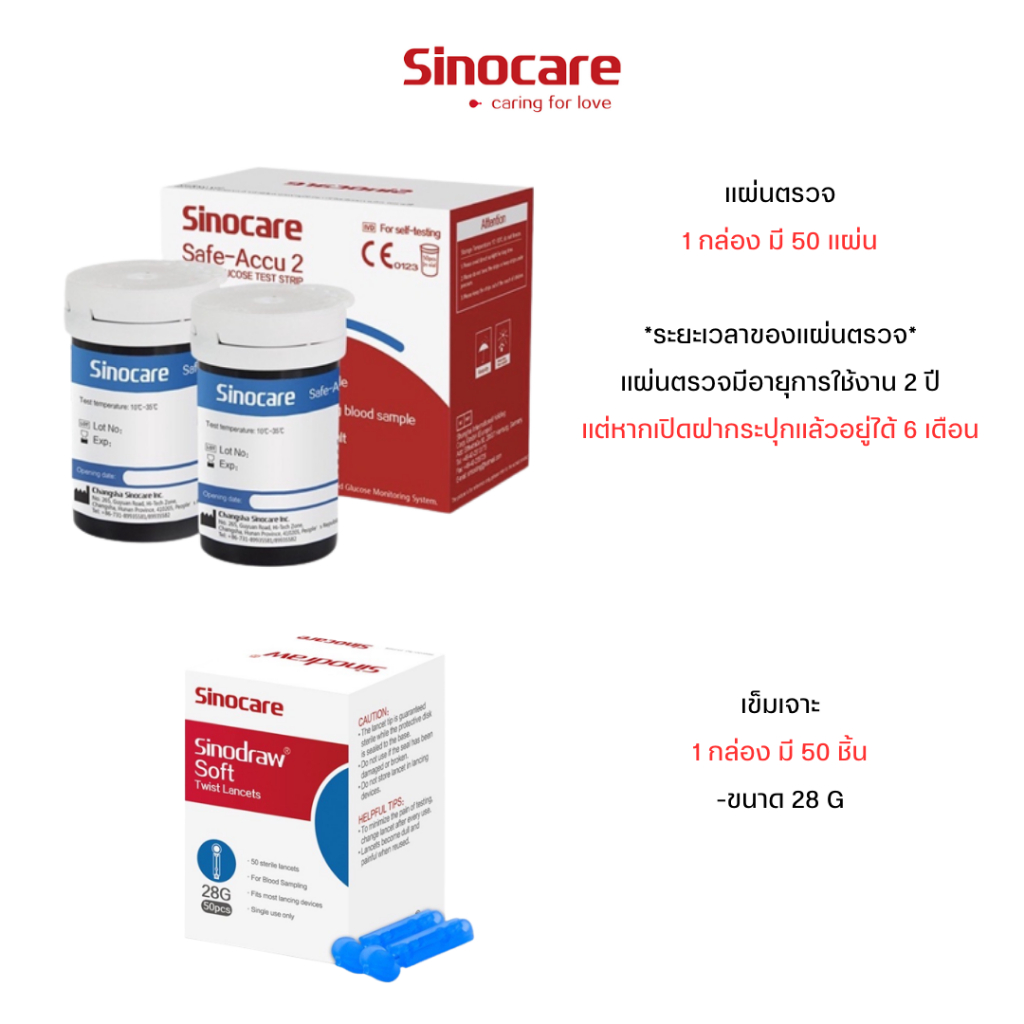 Sinocare Thailand เฉพาะแผ่นตรวจ+เข็มเจาะ ตรวจวัดระดับน้ำตาลในเลือด(เบาหวาน)ของเครื่อง Safe Accu2 เท่านั้น ยี่ห้อSinocare