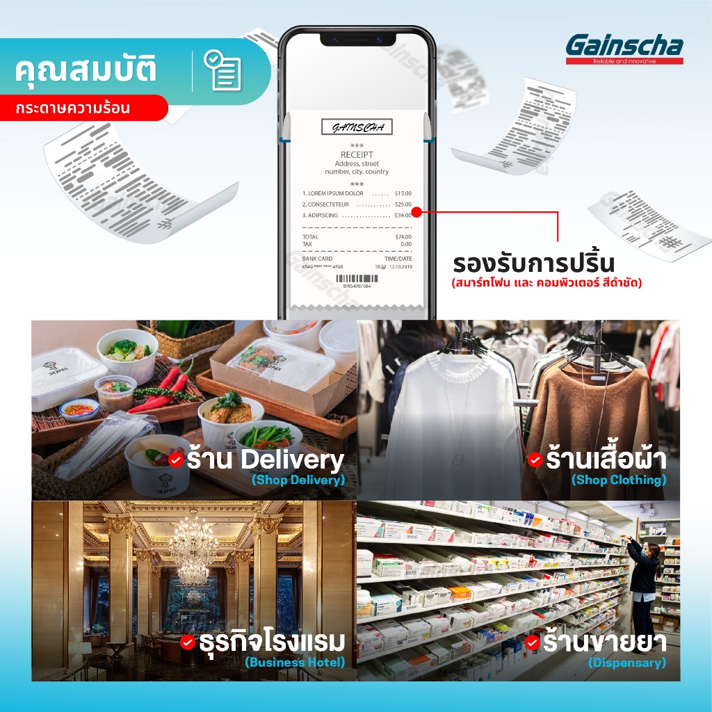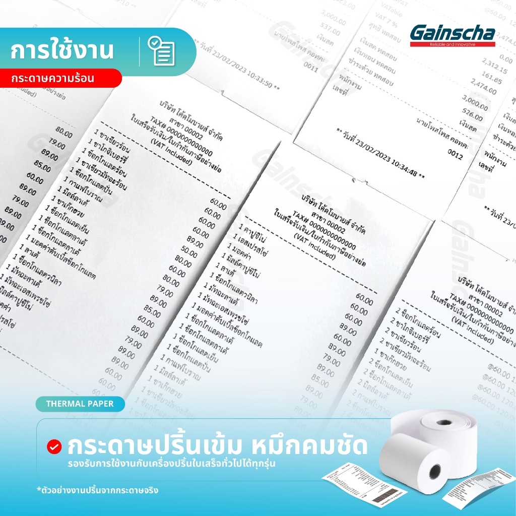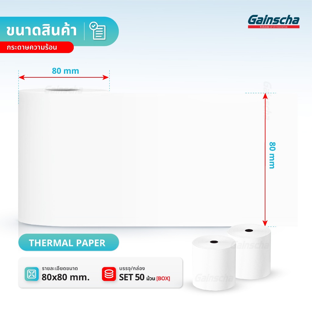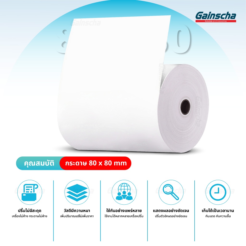 Gainscha 80x80 บิลใบเสร็จ 1ลัง 50ม้วน กระดาษใบเสร็จ Thermal paper 65gsm ไม่ใช้หมึก กระดาษความร้อน