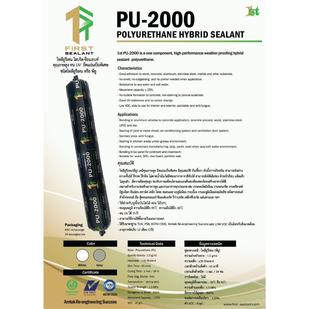 First Sealant รุ่น PU-2000 กาวโพลียูรีเทน กาวพียู กาวยาแนวไส้กรอก กาวยาแนวก่อสร้าง ขนาด 600 ml