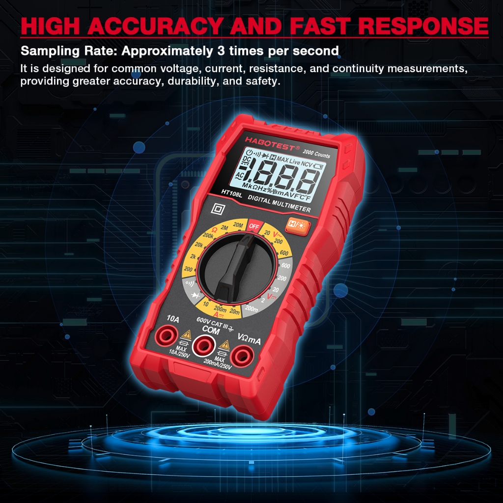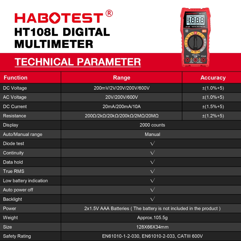 HABOTEST HT108L มัลติมิเตอร์ดิจิทัล 600V/10A AC/DC แรงดันไฟฟ้า 2000 นับ มัลติมิเตอร์ โวลต์มิเตอร์ แอมมิเตอร์ โอห์ม ทรานซิสเตอร์ ทดสอบ มัลติมิเตอร์ดิจิตอล