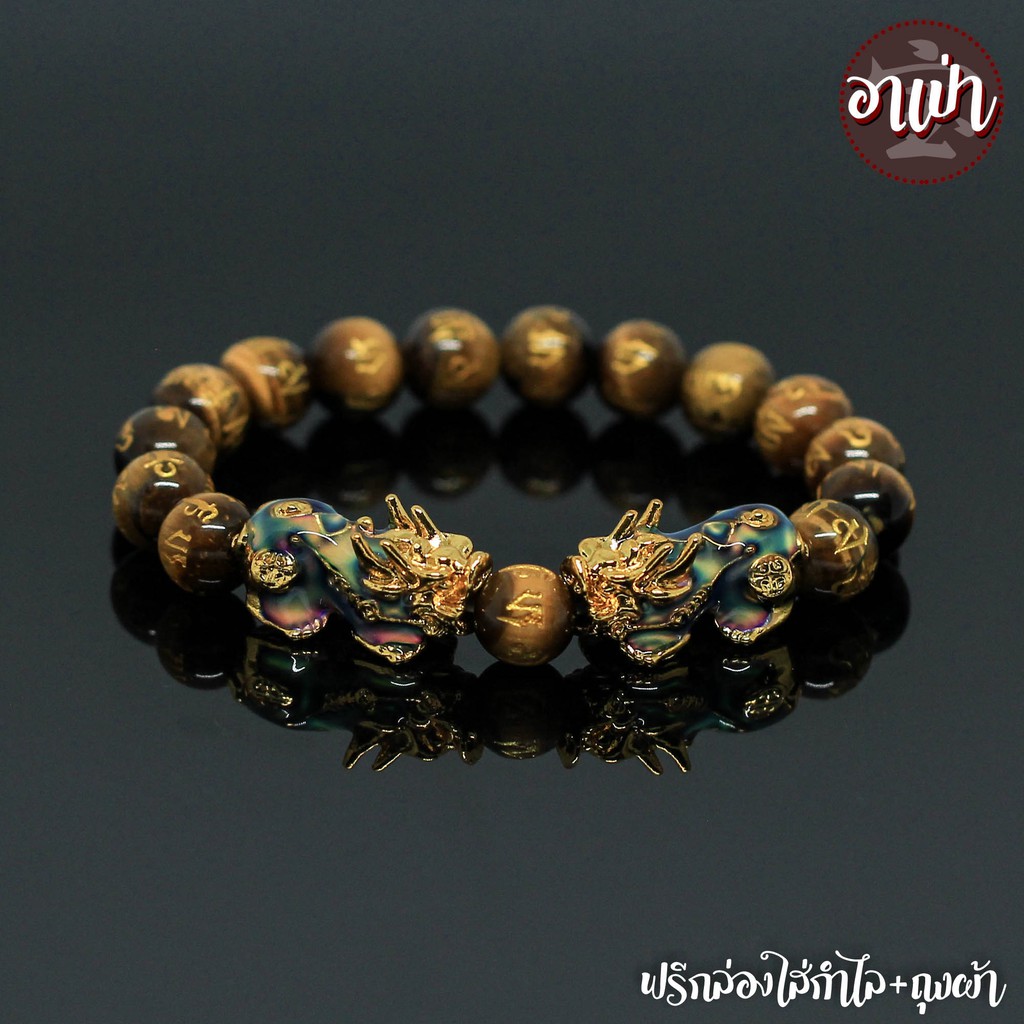 หินไทเกอร์อายส์ พลอยตาเสือ แกะสลักบทสวดมนต์ทิเบต Tiger Eye ขนาด 10 มิล ปี่เซียะเปลี่ยนสีคู่ หินแท้ 100% หินตาเสือ