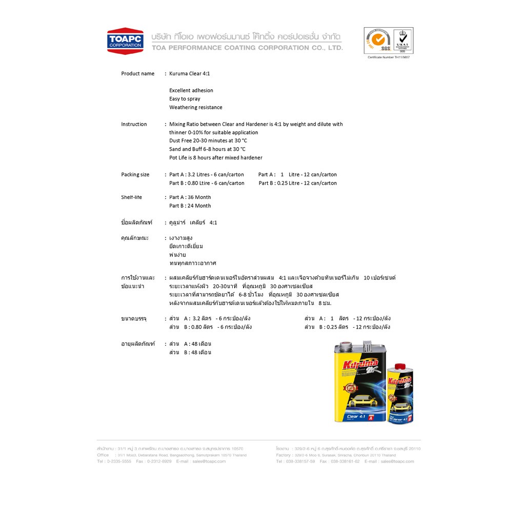 (ชุดเล็ก) แลคเกอร์ 2K KURUMA 2K TOA เคลียร์ 4:1 ขนาด (A) 0.8 ลิตร +น้ำยา (B) 0.2 ลิตร/b