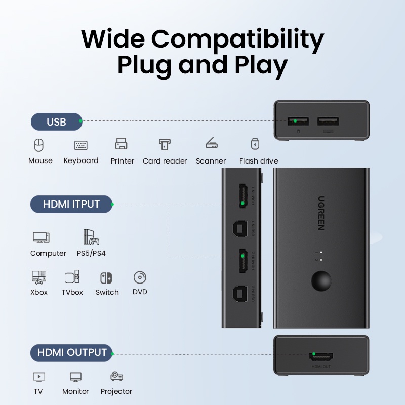 Ugreen กล่องสวิตช์ HDMI KVM 4K60Hz 2 IN 1 OUT Ultra HD HDMI สําหรับแบ่งปันมอนิเตอร์