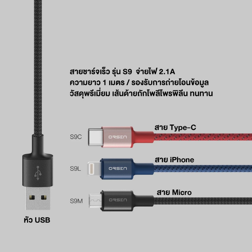 Eloop S9 สายชาร์จเร็ว สายถัก ทนทาน S9L / S9M / S9C USB Data Cable 2.1A L-Cable / Micro / Type-C
