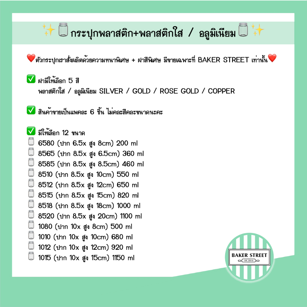 กระปุกพลาสติกเนื้อหนา+ฝาใส/อลูมิเนียม แพค 6 ชิ้น (เลือกขนาดและสีด้านในค่ะ)