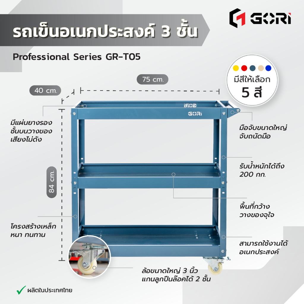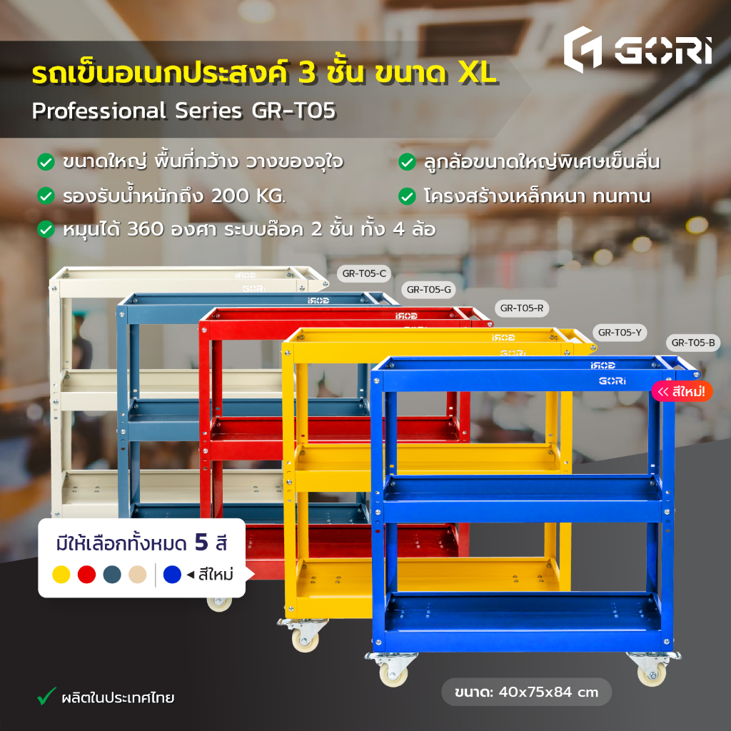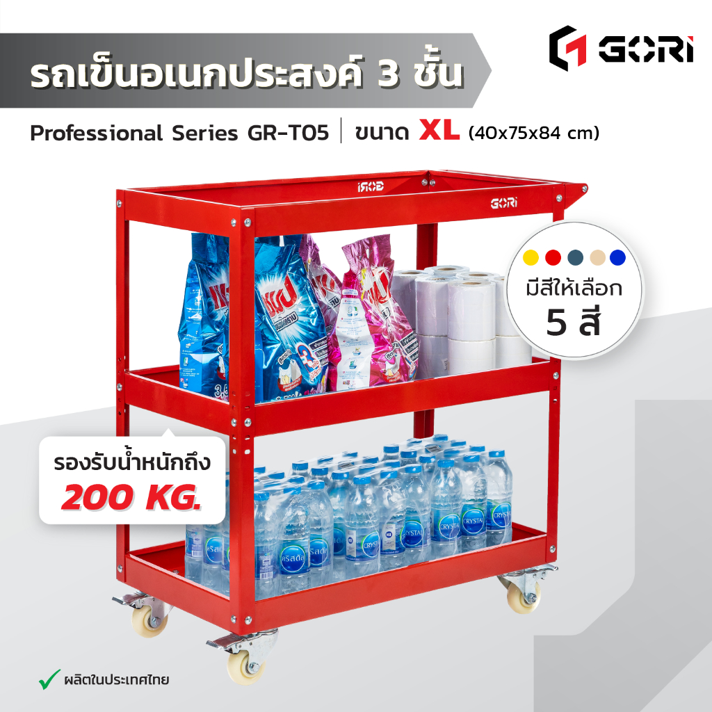 GORI รถเข็นเอนกประสงค์ 3 ชั้น รถเข็นเครื่องมือช่าง ปรับระดับได้ ขนาด XL รับน้ำหนักได้ 200 kg ล้อล๊อคได้ GR-T05