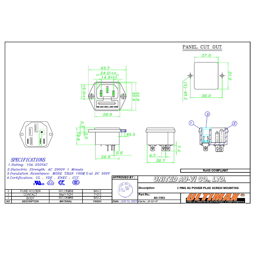 ULTIMAX AC-7053 ปลั๊ก AC 220V 3ขา ตัวผู้ มีฟิวส์ ติดแท่น ปีกยึด มาตรฐาน UL VDE ENEC ปลอดภัยสูง เต้าปลั๊ก เต้าเสียบ C14