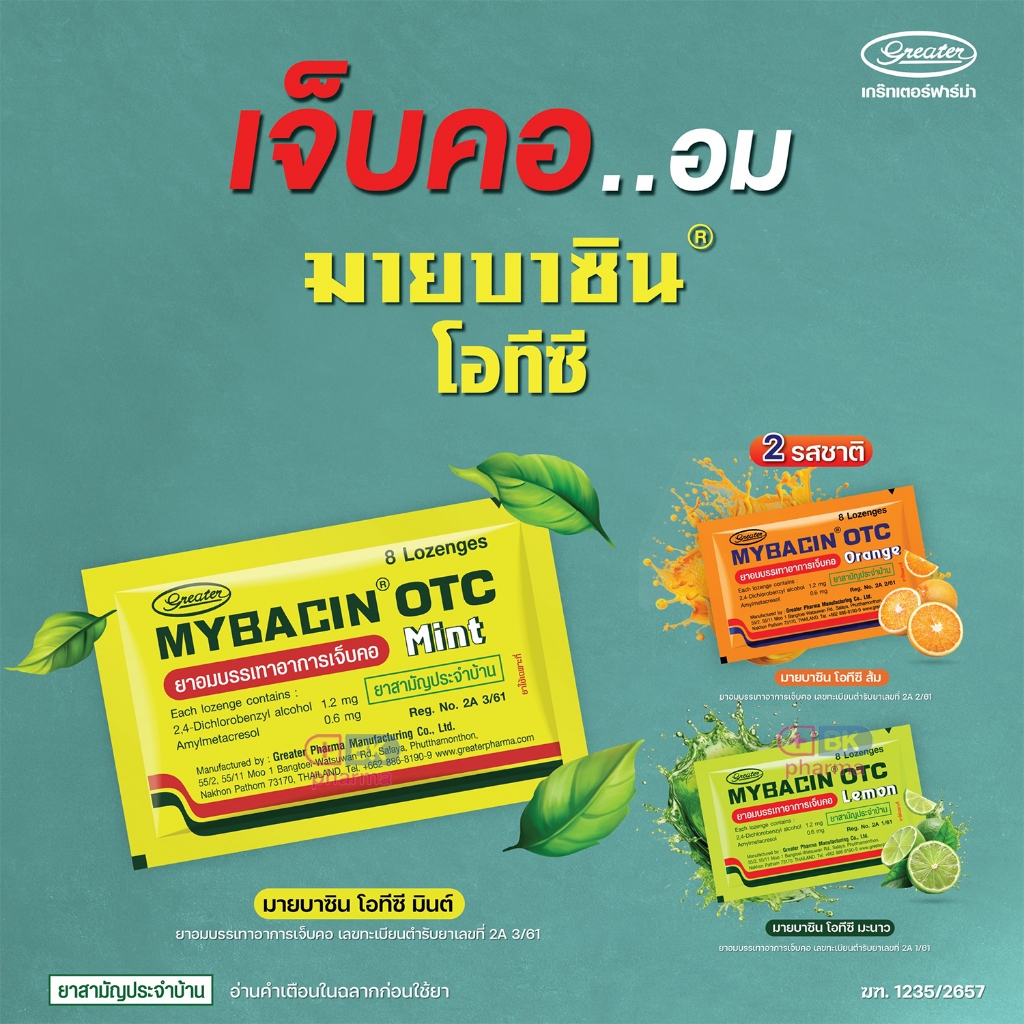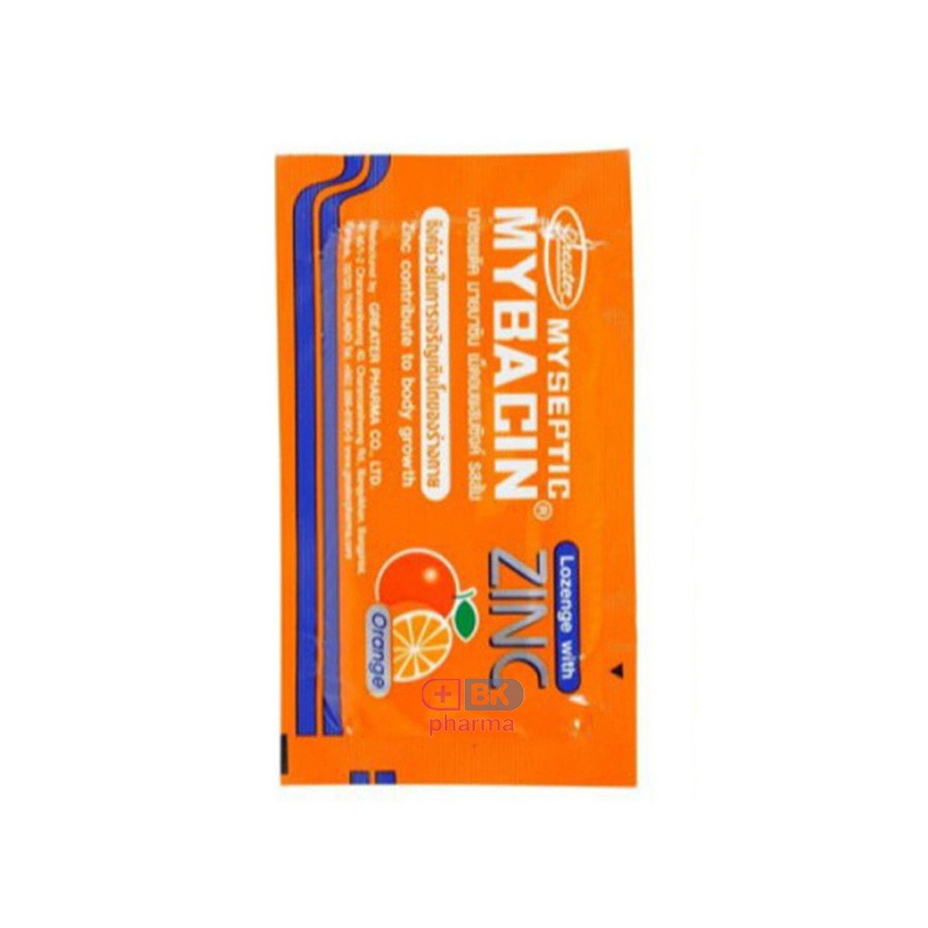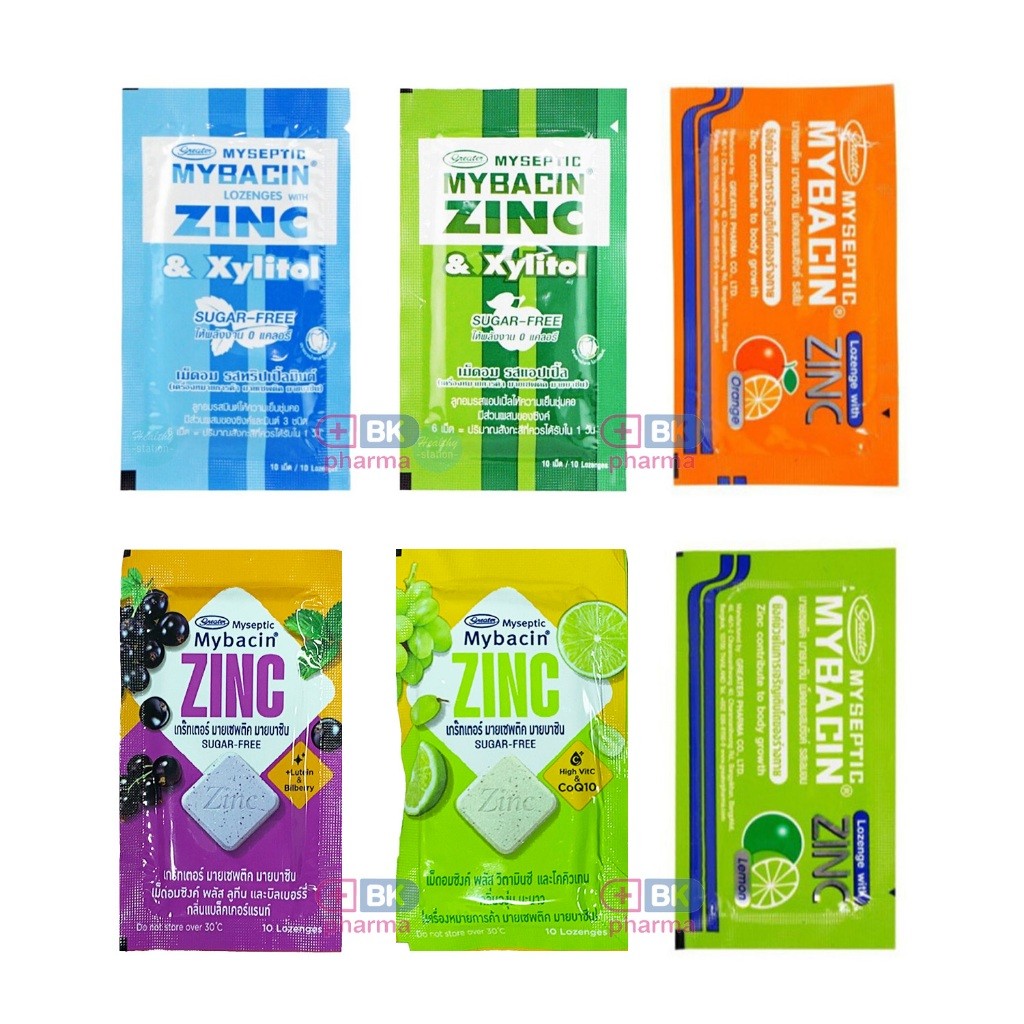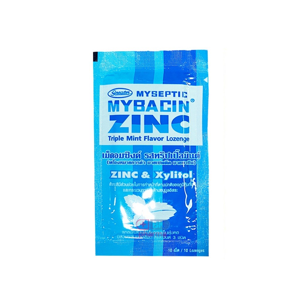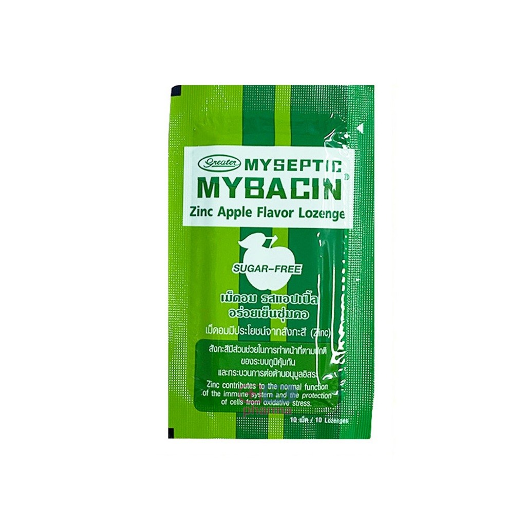 รสใหม่ ! Mybacin Lozenge Zinc & Xylitol Sugarfree มายบาซิน ซิงค์ เม็ดอมผสมซิงค์ Tripple Mint , Apple Mint ซอง 10 เม็ด