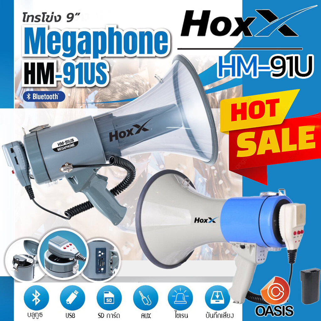 มีส่งด่วน[รวมVAT] โทรโข่ง 9 นิ้ว พร้อมไมค์ มี Bluetooth ไซเรน อัดเสียงได้ Megaphone HOXX HM-91U, HM-91US โทรโข่งหาเสียง