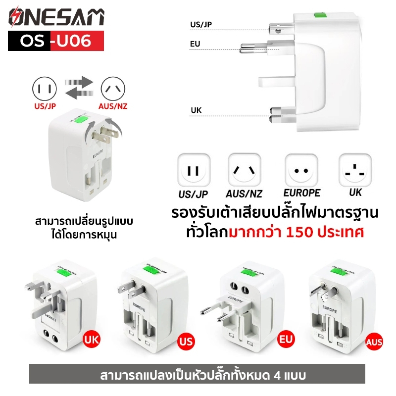 อแดปเตอร์ตัวแปลงปลั๊กทั่วโลก ONESAM รุ่น OS-U06 ขาปลั๊กแปลง Universal Travel Adaptor สีขาว ใช้งานได้มากกว่า 150 ประเทศทั