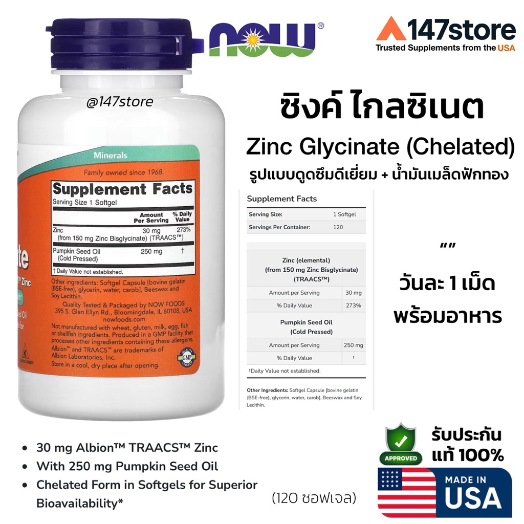 [แท้100%] Now Zinc Glycinate รุ่นใหม่ | ซิงค์ เสริมภูมิ ลดสิว ลดผมร่วง | 30 mg Albion™ + Pumpkin Seed Oil | 120 ซอฟเจล