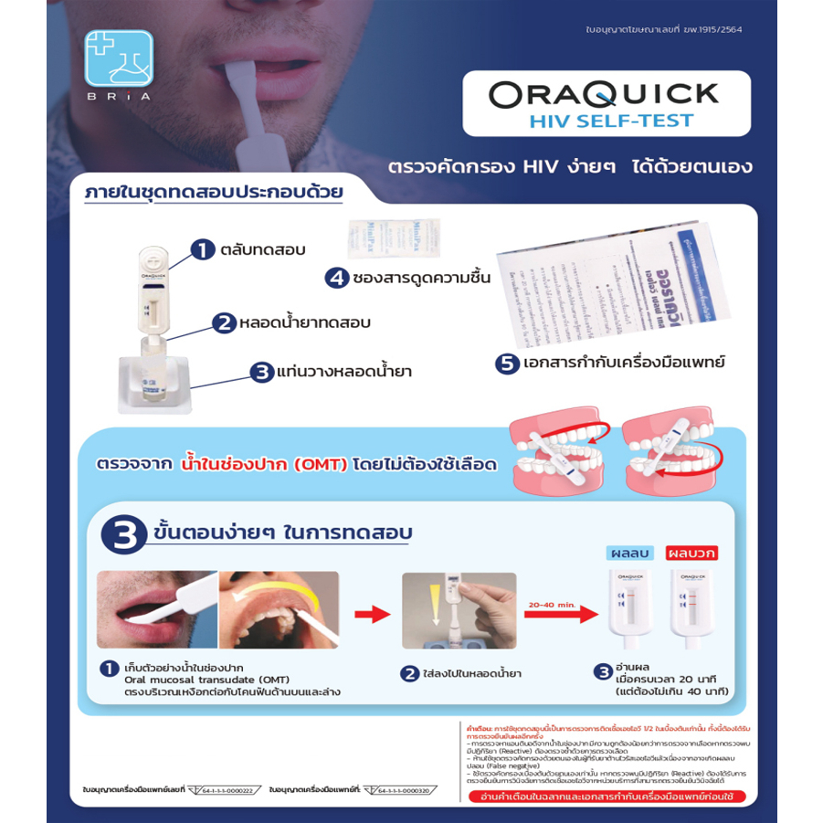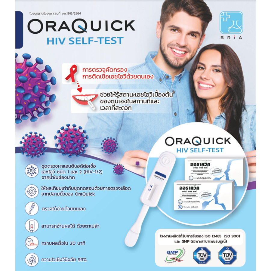 OraQuick HIV Self Test กล่อง ออราควิก ชุดตรวจ เอชไอวี ด้วยตนเอง ตรวจจากน้ำในช่องปาก ไม่ต้องเจาะเลือด แม่นยำ 1 กล่อง