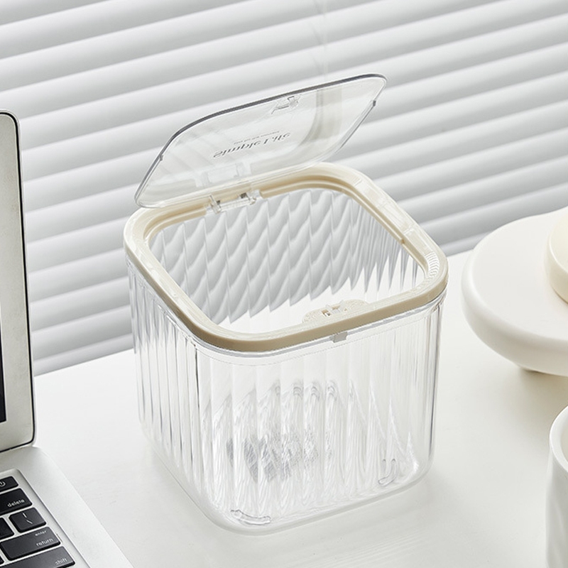 ถังขยะตั้งโต๊ะดีไซน์หรูพรีเมียมที่เปลี่ยนบรรยากาศโต๊ะทำงานได้เลยครับ วัสดุใสสะอาดตามองเห็นปริมาณขยะมาพร้อมฝาปิดแบบกดที่สมูทและใช้งานง่าย