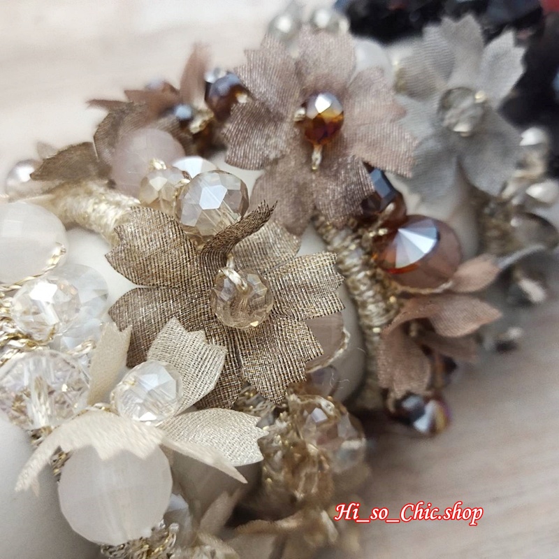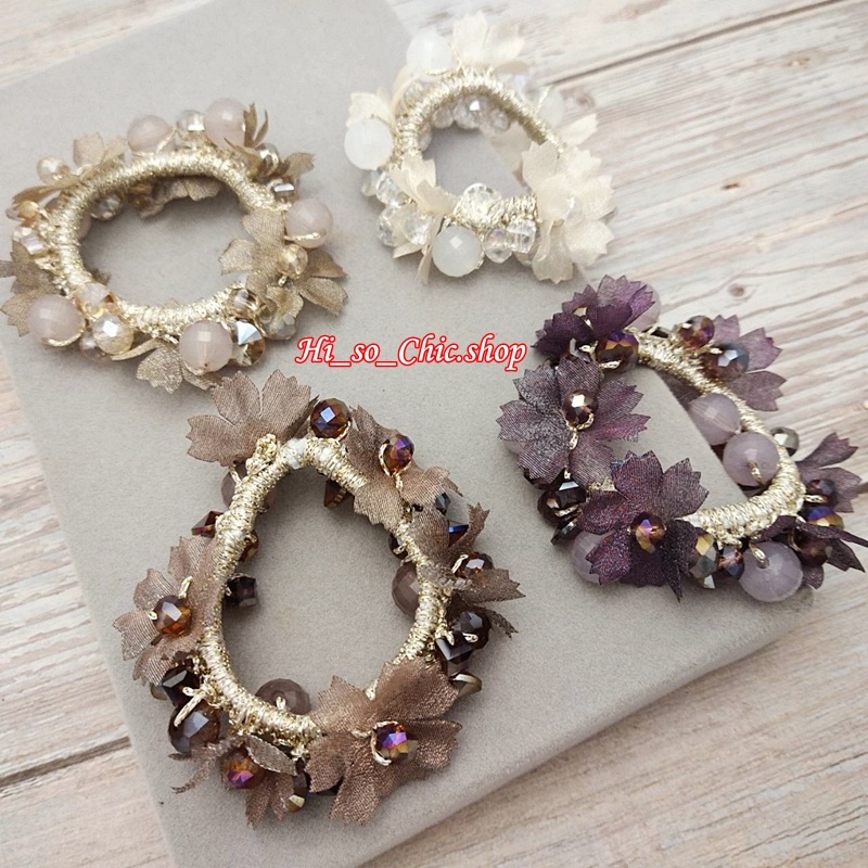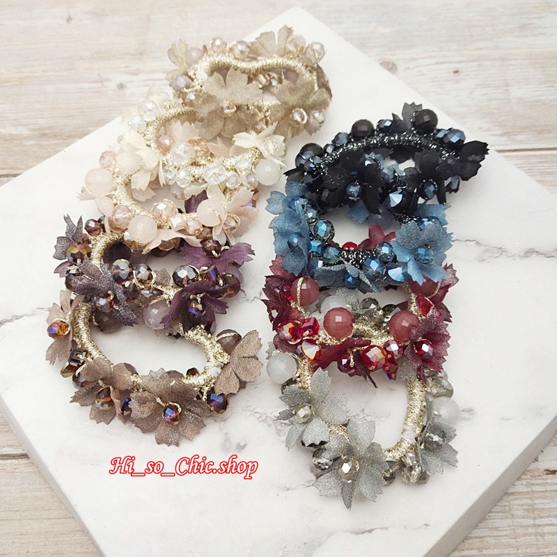HisoChic #004 ยางมัดผม ยางรัดผม ตกแต่งด้วยลูกปัด+ดอกไม้ผ้า+เม็ดคริสตัล แนวหวานหรู (ราคาต่อชิ้น)