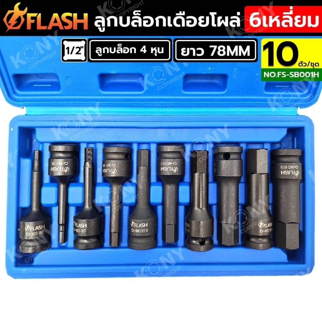 FLASH ชุดบล็อกเดือยโผล่ หกเหลี่ยม 10 ตัว/ชุด 4 หุน ลูกบล็อกเดือยโผล่ 6 เหลี่ยม NO.FS-SB001H
