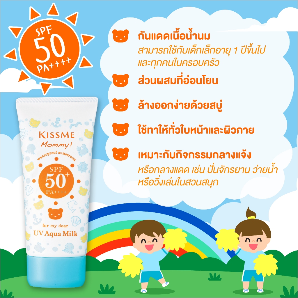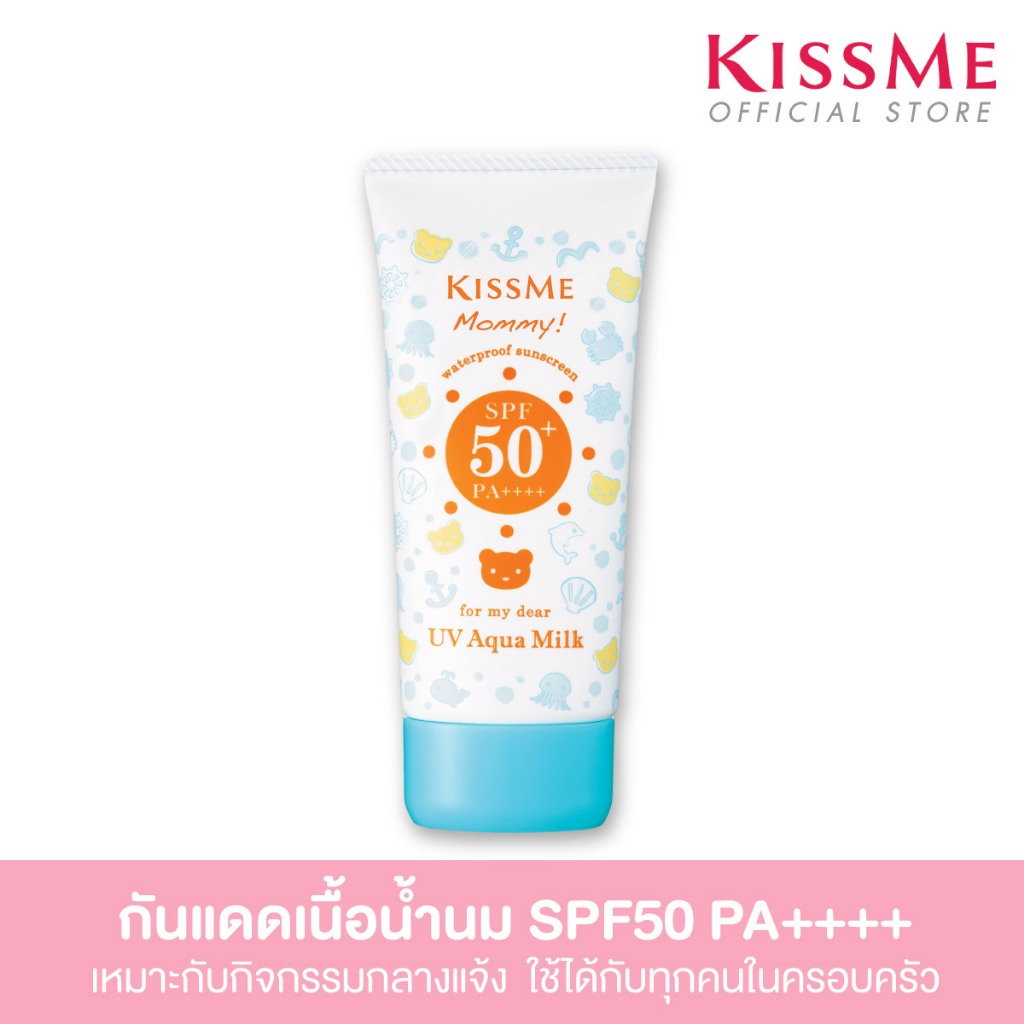คิสมี โลชั่นกันแดดเนื้อน้ำนม สูตรกันน้ำ มัมมี่ ยูวี อะควา มิลค์ KISS ME Mommy UV Aqua Milk SPF50 PA++++ 50g.